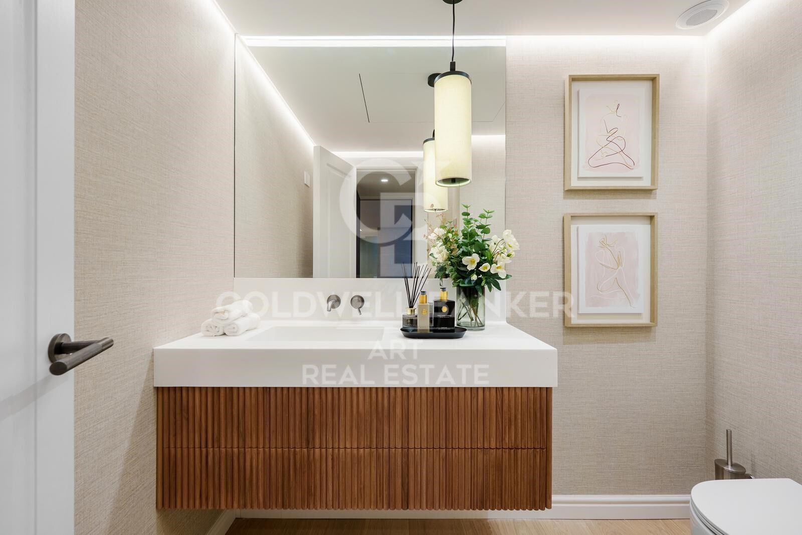La cuisine est l'un des points forts de la propriété. Conçue avec des lignes épurées et des matériaux haut de gamme, elle comprend un grand îlot central, des appareils électroménagers intégrés et de nombreux rangements dissimulés dans une menuiserie sur mesure. La disposition favorise l'interaction, avec des vues directes sur le salon et un accès fluide aux terrasses extérieures et à la piscine. Cette combinaison de design et de fonctionnalité fait du niveau principal l'un des atouts majeurs de la villa.