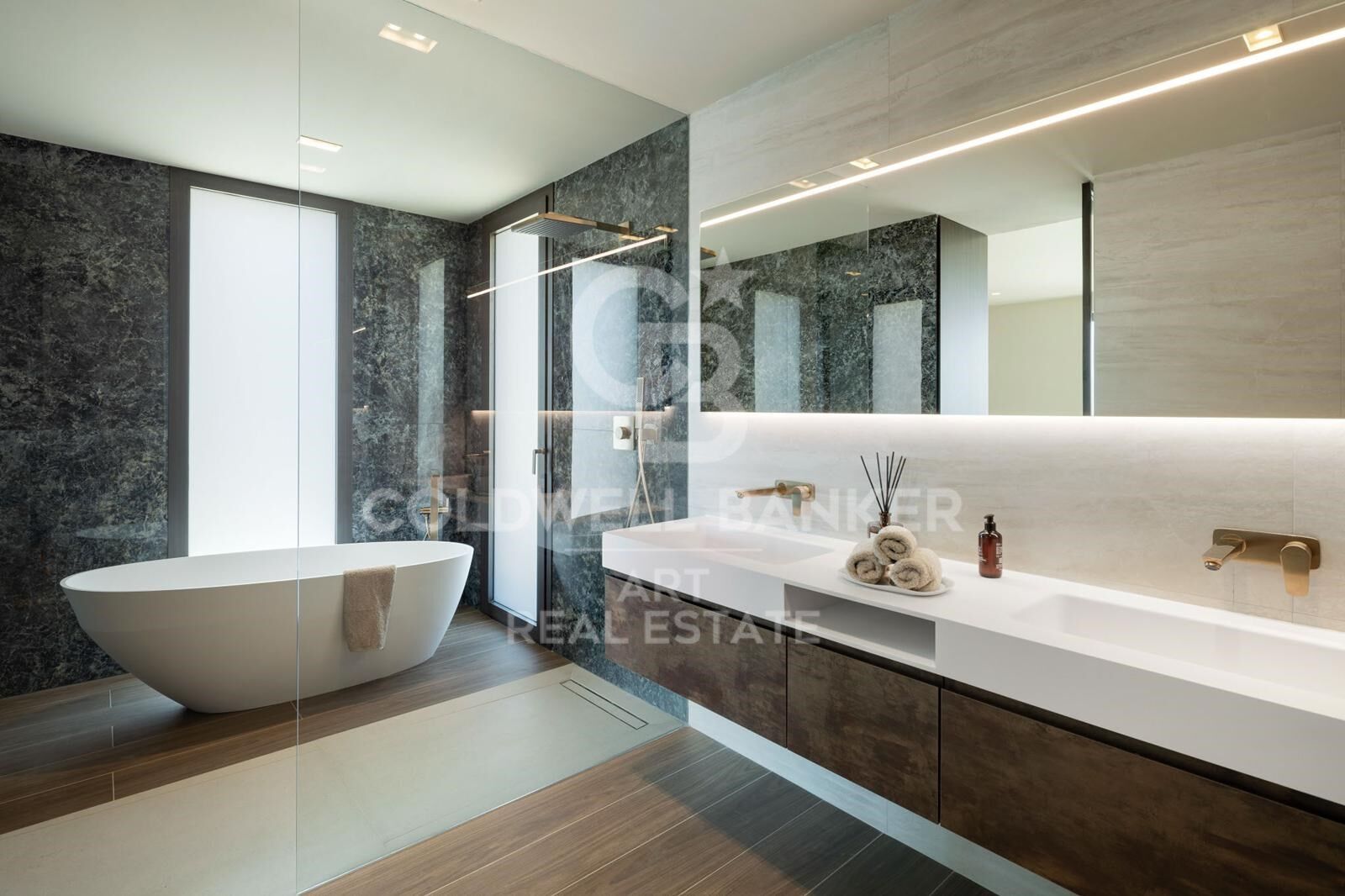 Chaque détail illustre le savoir-faire haut de gamme et le design contemporain : cuisine Modulnova, menuiserie sur mesure, fenêtres en aluminium Schüco et porte d'entrée pivotante Schüco éclairée par LED.