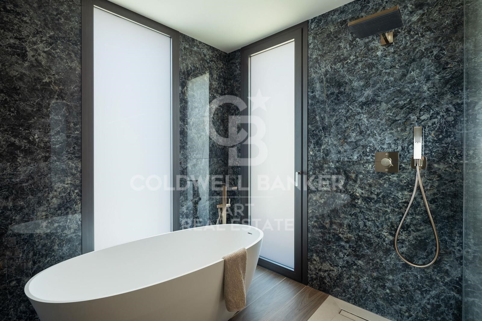 Conçue pour un mode de vie intelligent et durable, la propriété affiche une note énergétique 'A' grâce à un système solaire photovoltaïque de 10 kW. Le confort est assuré toute l'année avec le système intelligent Koolnova, le chauffage au sol sur tous les niveaux et un système aérothermique de 300 L pour l'eau chaude. La villa dispose également de 5 places de stationnement privées.