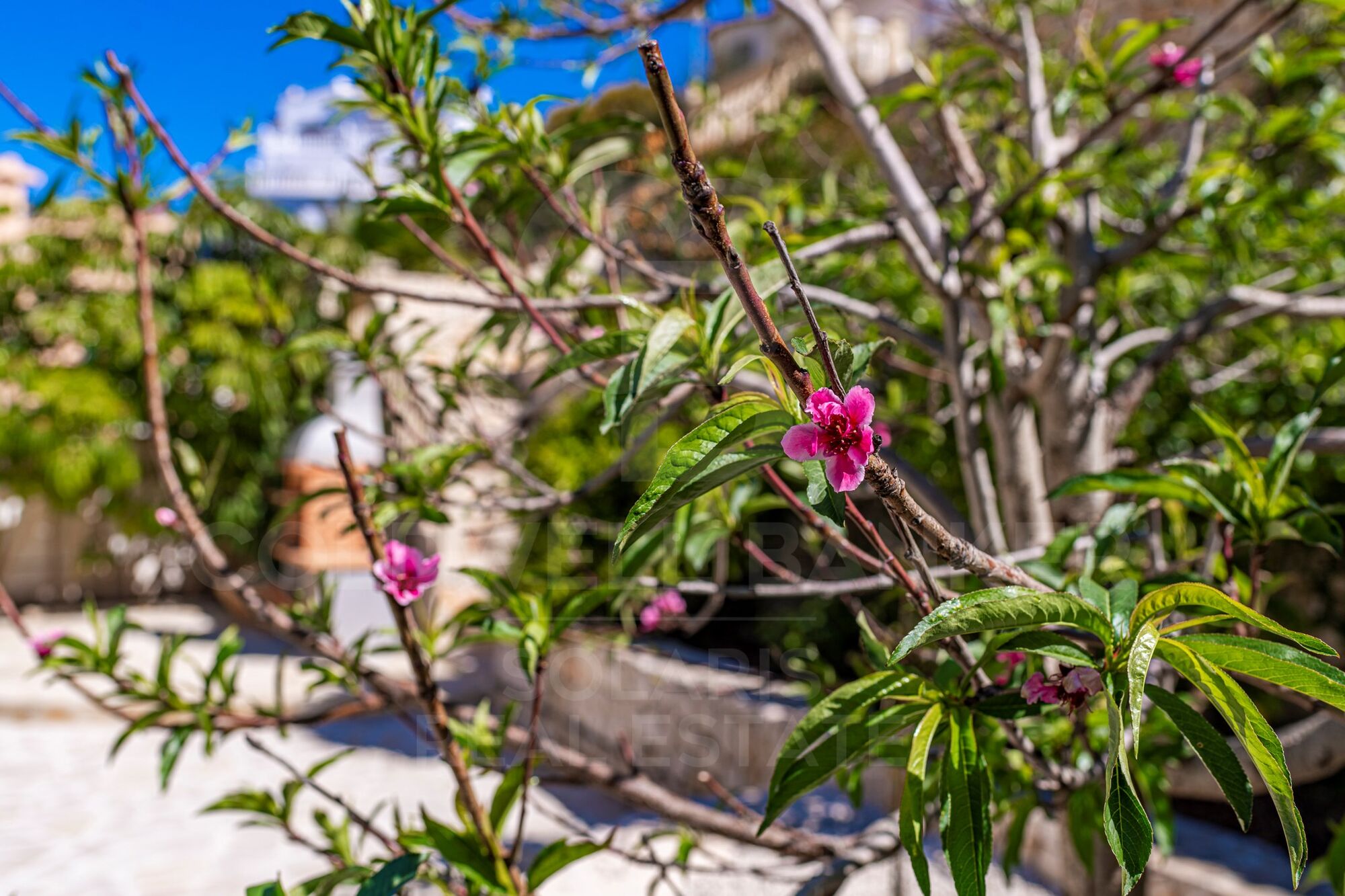 La terrasse supérieure est entourée de verdure et de murs de soutènement en pierre naturelle, fabriqués à la main par des experts locaux. Chaque terrasse présente une variété d'arbres fruitiers (pêches, oranges, mandarines, citrons verts, citrons, grenades, nèfles, abricots, ainsi que des kakis et des avocats nouvellement ajoutés), ainsi que du jasmin, des roses et des mimosas.