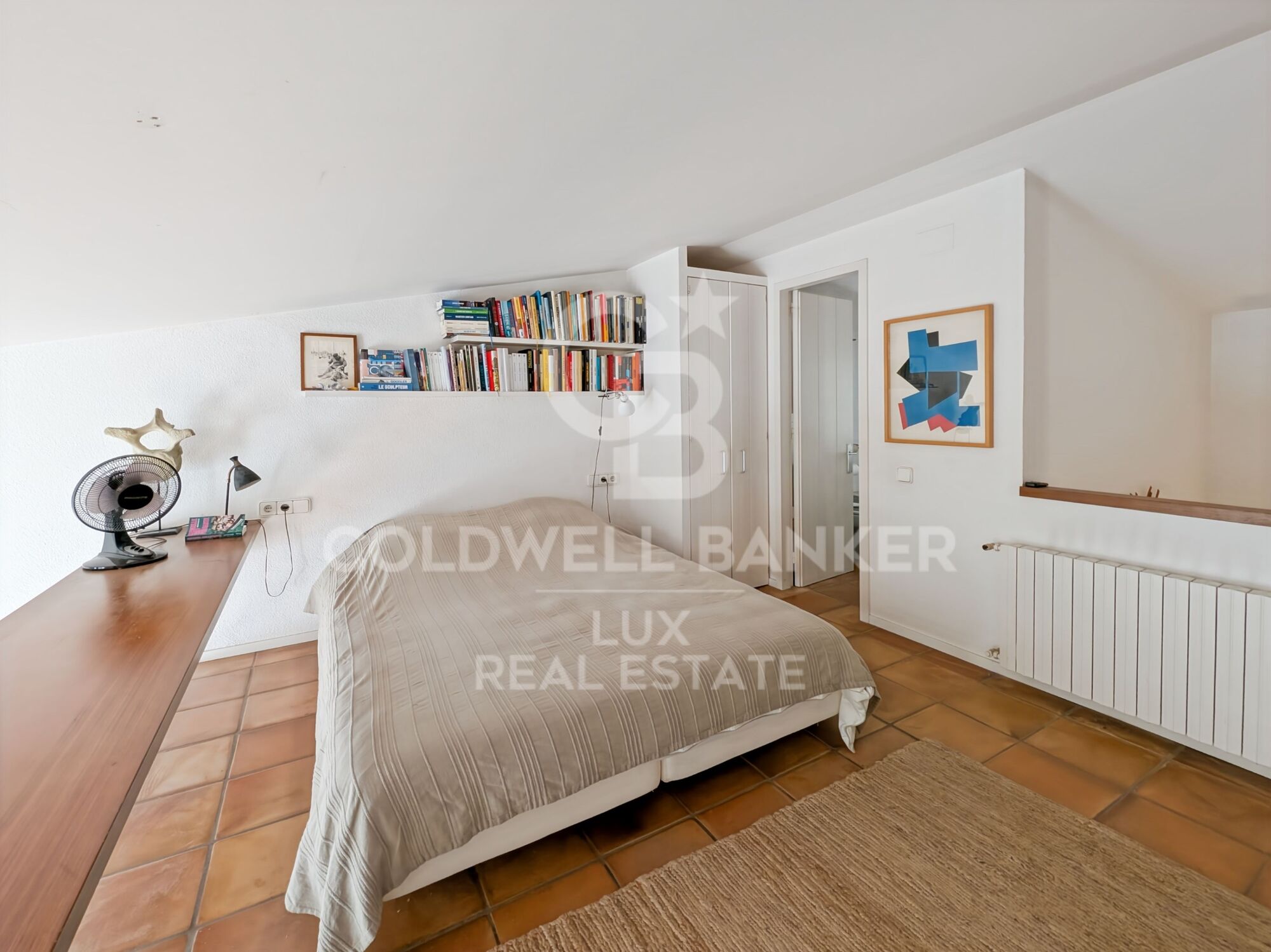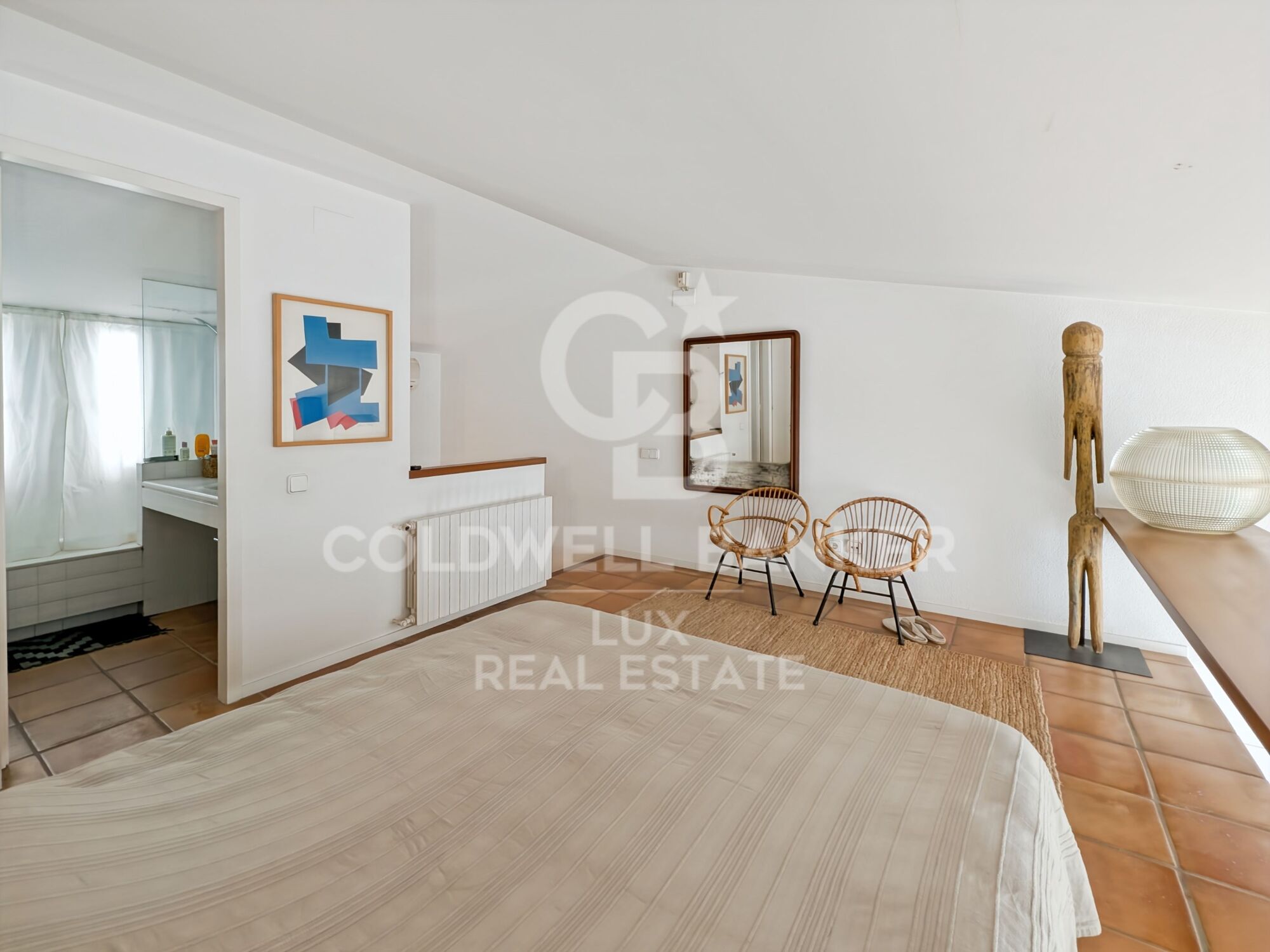 Le séjour se découvre au dernier niveau, dans une pièce de vie traversante avec balcon orienté ouest et une cheminée. La cuisine est indépendante. Un escalier mène à une mezzanine transformée en suite ouverte, avec chambre et salle de bains.