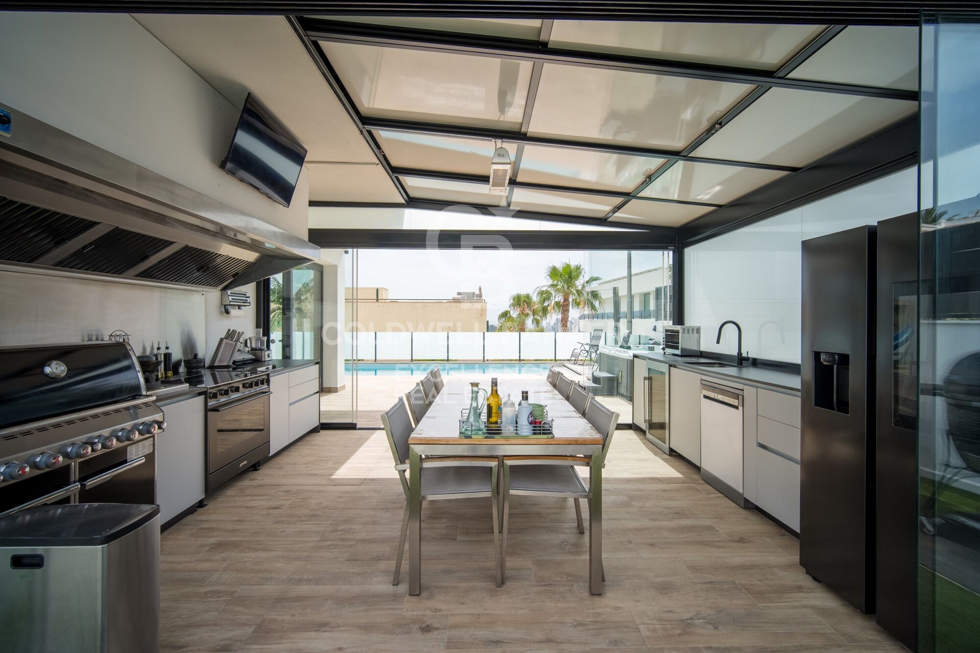 -Incroyable salon-salle à manger-cuisine vitrée de 30m2 avec équipement haut standing : frigo américain, four professionnel, grand barbecue, plancha, wok feu, cave à vin. Espace pour une table de 14 convives,