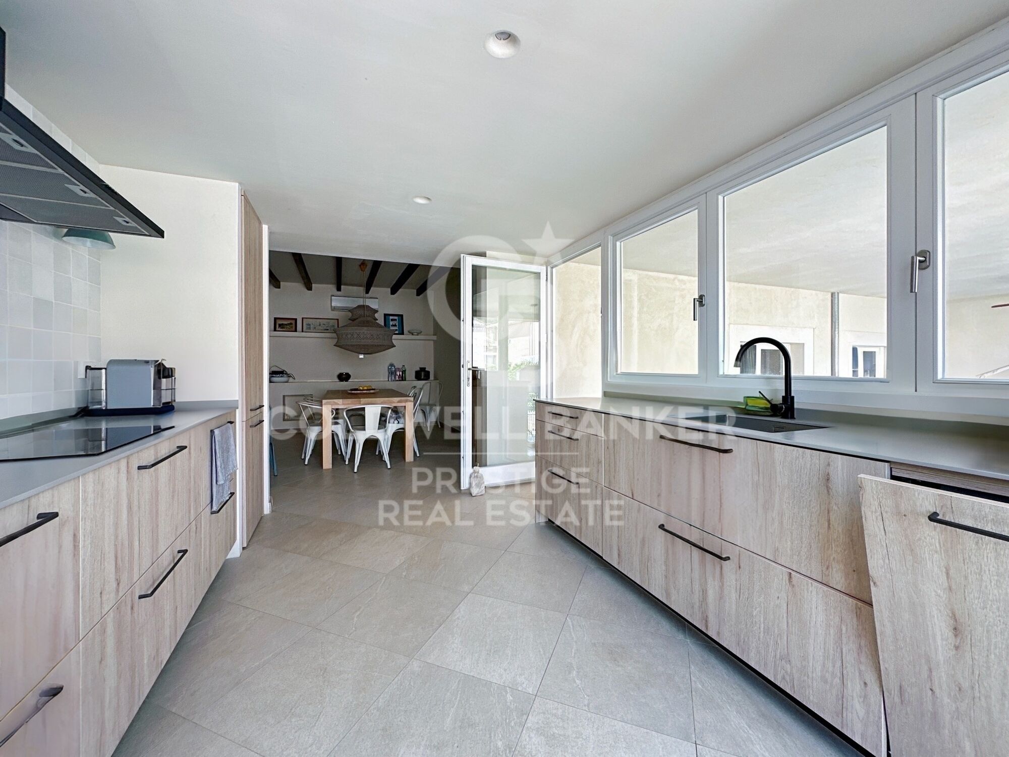 Cette propriété exclusive, d'une superficie de 450 m² répartie sur deux niveaux, a été conçue pour maximiser le confort et le luxe. La maison dispose de vastes espaces de vie pour l'été et l'hiver, comprenant un salon d'hiver avec cheminée et un salon d'été qui s'étend sur de généreuses terrasses. Les salles à manger, divisées en zones pour l'été et l'hiver, permettent de profiter de chaque repas dans le cadre idéal, avec des vues imprenables sur le château médiéval de Capdepera et la mer.