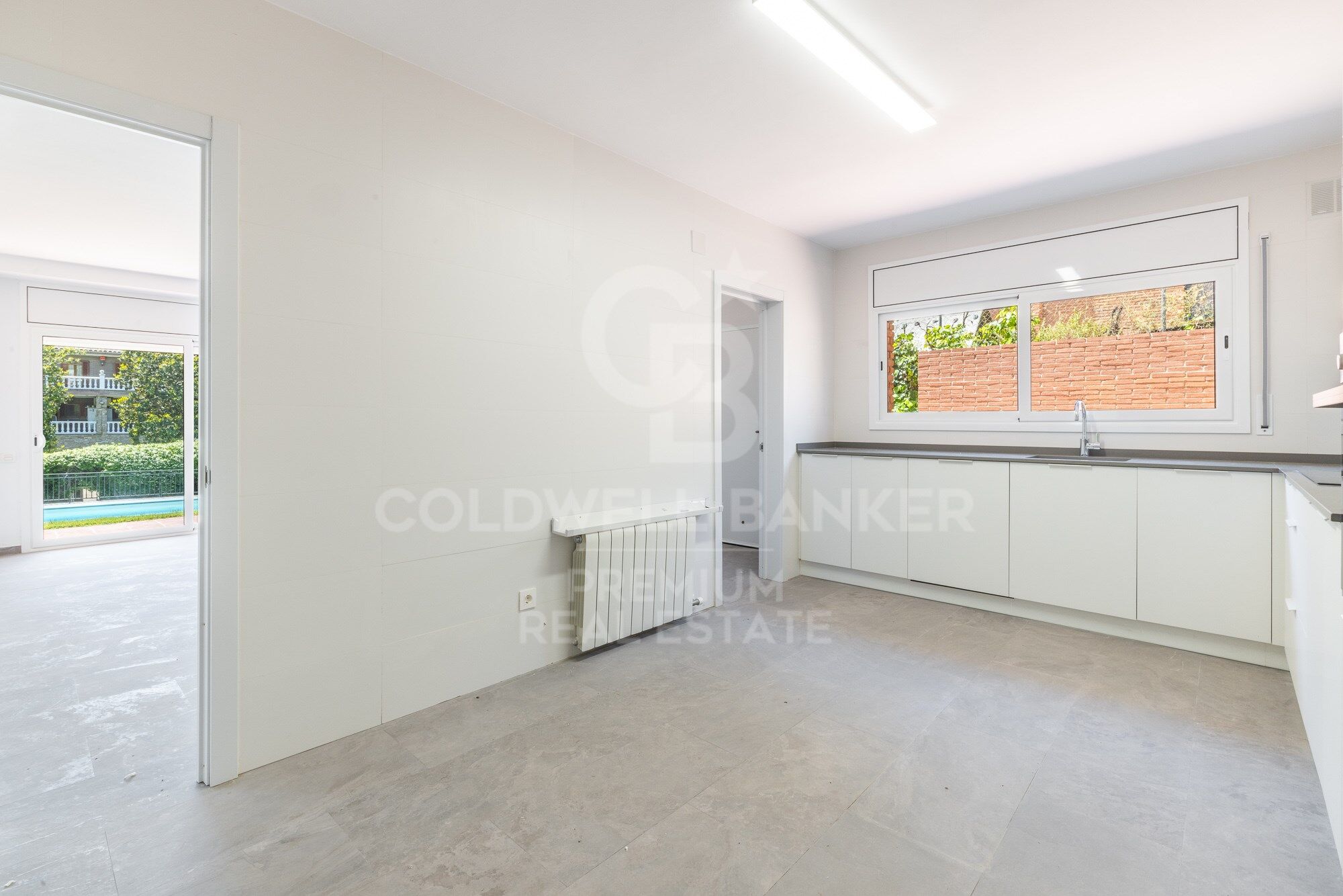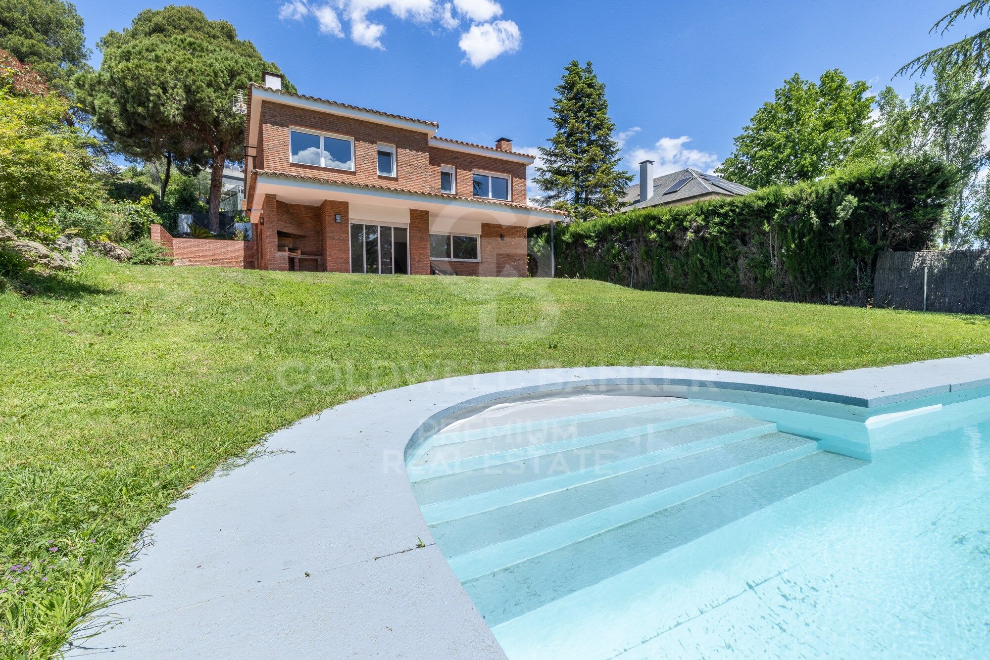 À l'étage inférieur, au pied du jardin et de la piscine, nous avons le magnifique salon avec cheminée, très lumineux grâce à une grande fenêtre et des portes coulissantes qui nous permettent d'accéder directement au jardin. La vue de la couverture d'herbe verte qui atteint la piscine est très rafraîchissante et nous invite à sortir dans le jardin. Juste là, nous avons une grande terrasse couverte où nous pouvons profiter des déjeuners et des dîners en plein air sans perdre de vue l'immense piscine. Il y a suffisamment d'espace pour accueillir un espace de détente pour se reposer et profiter des conversations avec la famille et les amis. Enfin, nous avons un beau barbecue très bien intégré dans la construction. Reliée au salon et avec un accès direct à celui-ci, nous trouvons la cuisine, fonctionnelle et spacieuse, avec la capacité d'accueillir le coin bureau pour les petits déjeuners. De la cuisine, nous accédons à la zone d'eau et de chaudière qui a accès à l'extérieur ouest de la maison. Au même étage, il y a une pièce qui peut être utilisée comme bureau ou chambre à coucher, assistée par une salle de bain avec douche.