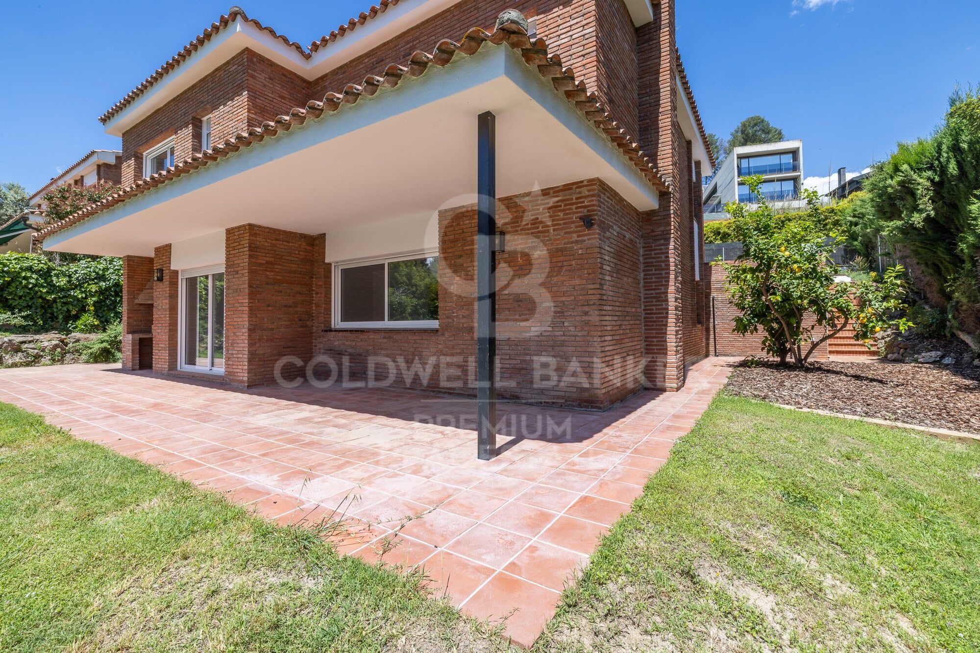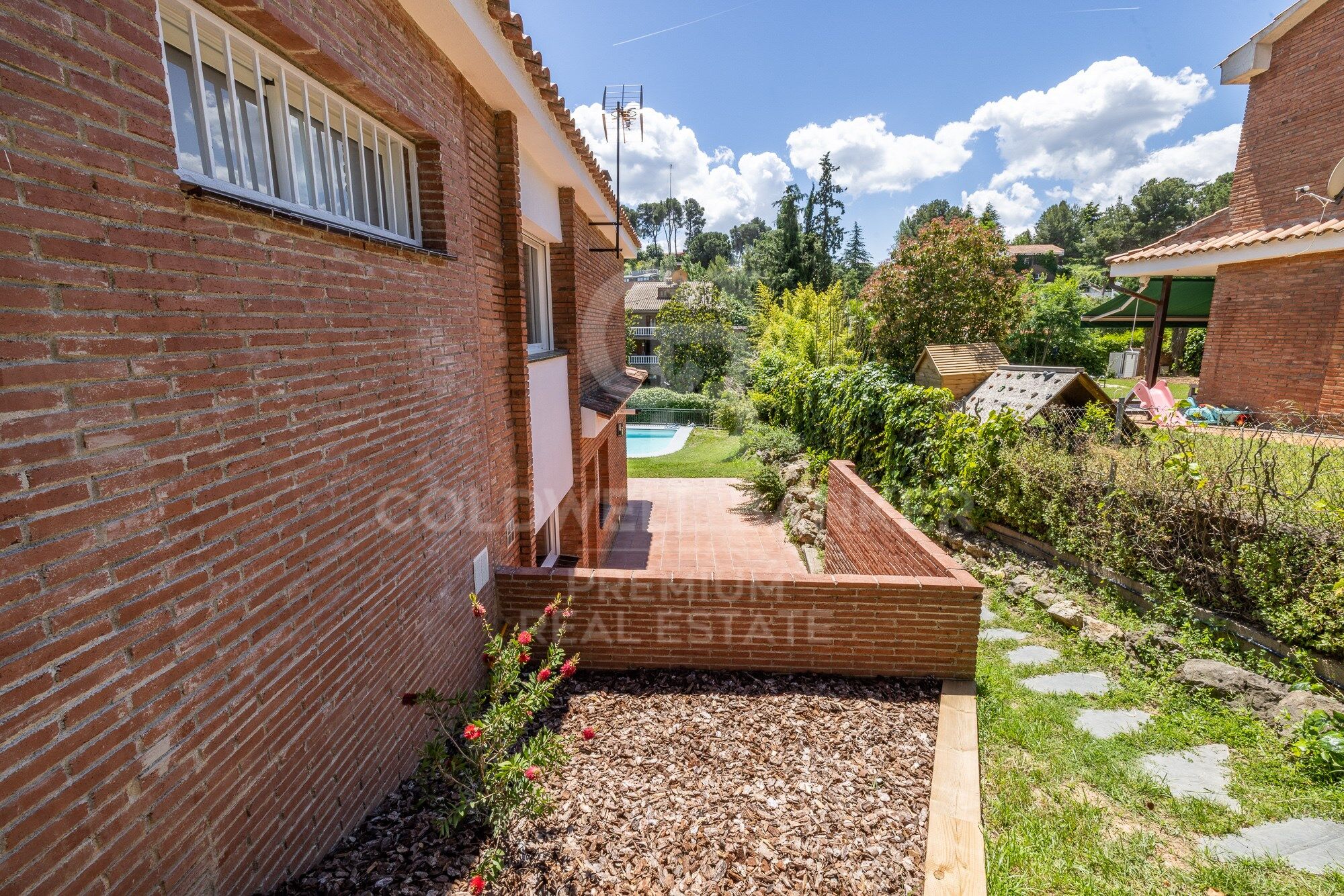 Si nous nous promenons dans la maison, chaque coin est soigné et a sa fonctionnalité. Outre la grande étendue de pelouse verte, la maison possède quelques arbres magnifiques. À l'entrée principale, un pin impressionnant est conservé et dans la piscine deux cèdres qui fournissent l'ombre nécessaire. Dans la partie orientale de la maison, nous avons la zone des arbres fruitiers.