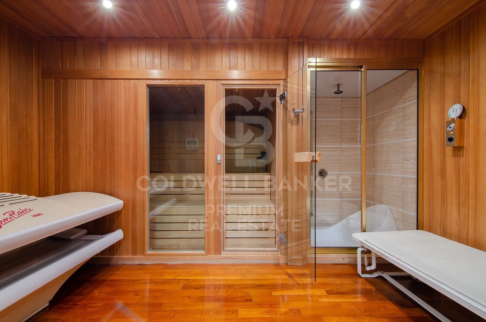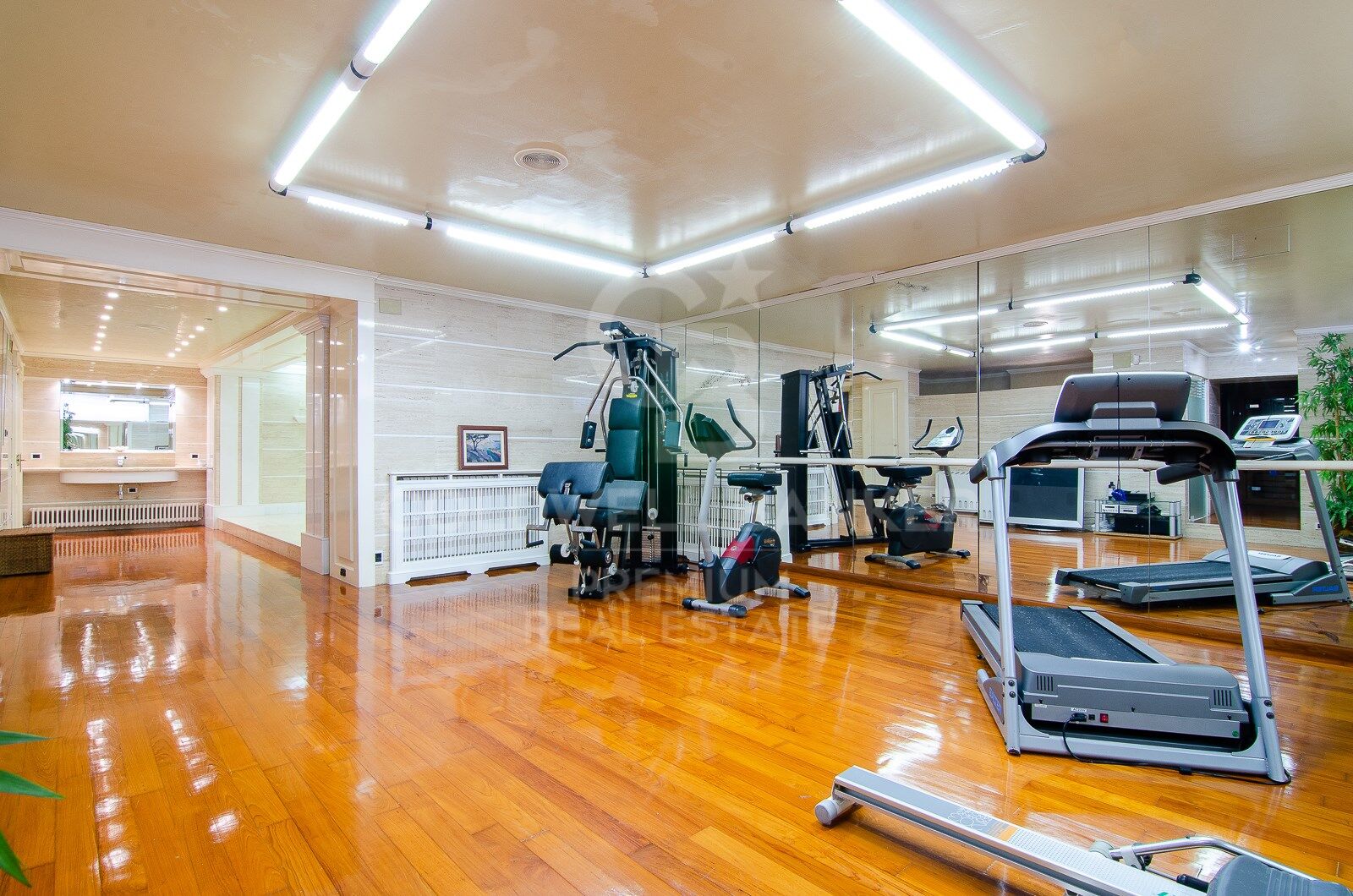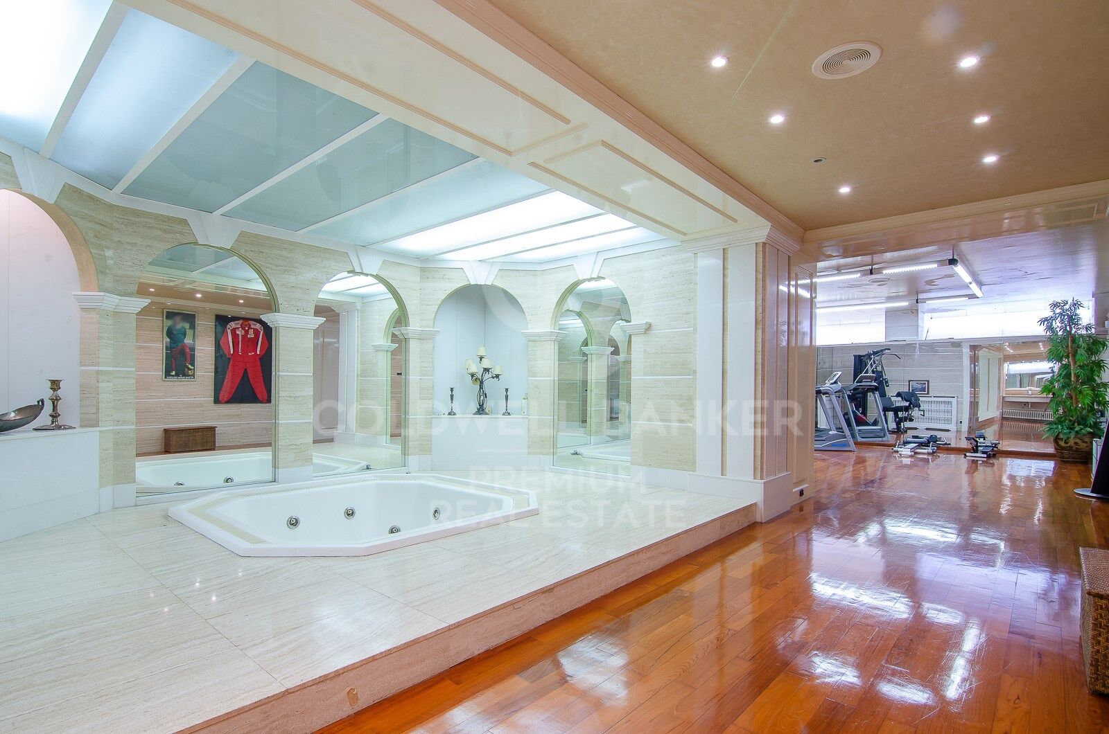 Au rez-de-chaussée où l'on accède également par le même escalier en bois, il y a le salon d'été avec le soutien d'une petite cuisine et une sortie directe devant la piscine et une chambre avec salle de bain, ainsi qu'une impressionnante salle de sport, un sauna et un espace de massage et un garage pour 3 grandes voitures. Le sol de cet étage est en céramique et dessine des formes géométriques avec des incrustations de bois.