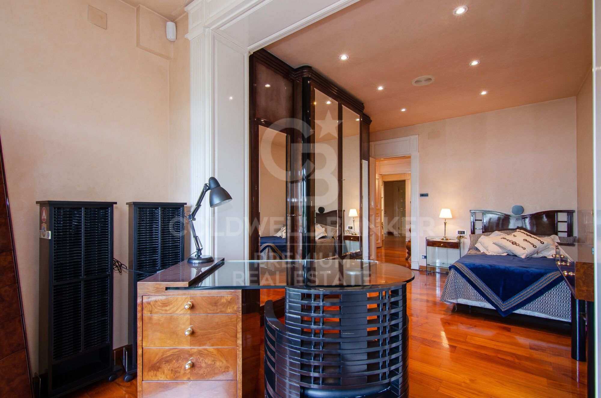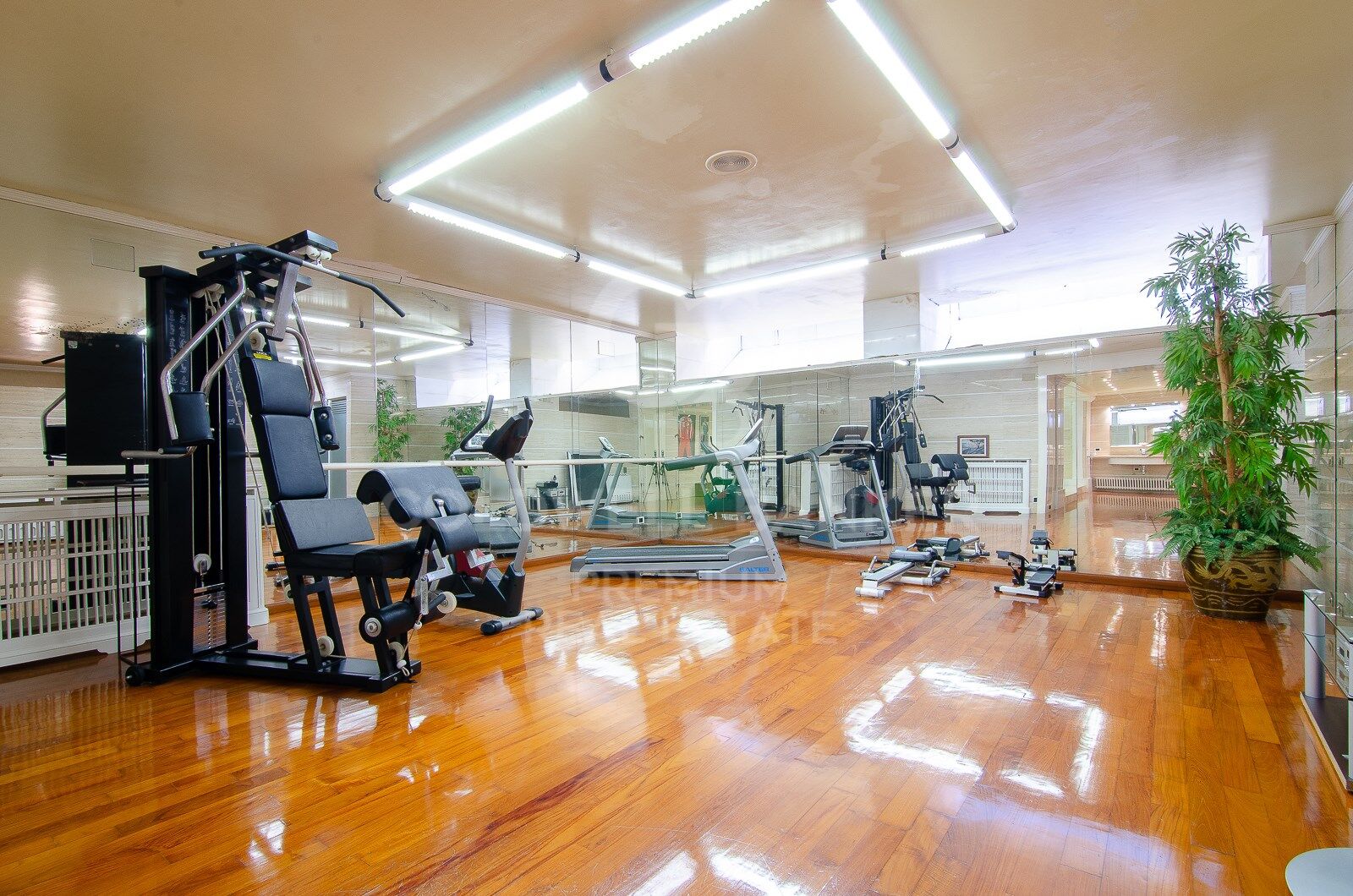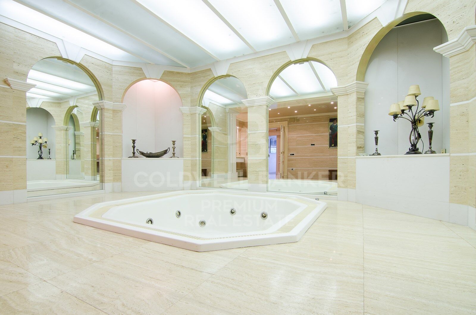 Au rez-de-chaussée où l'on accède également par le même escalier en bois, il y a le salon d'été avec le soutien d'une petite cuisine et une sortie directe devant la piscine et une chambre avec salle de bain, ainsi qu'une impressionnante salle de sport, un sauna et un espace de massage et un garage pour 3 grandes voitures. Le sol de cet étage est en céramique et dessine des formes géométriques avec des incrustations de bois.