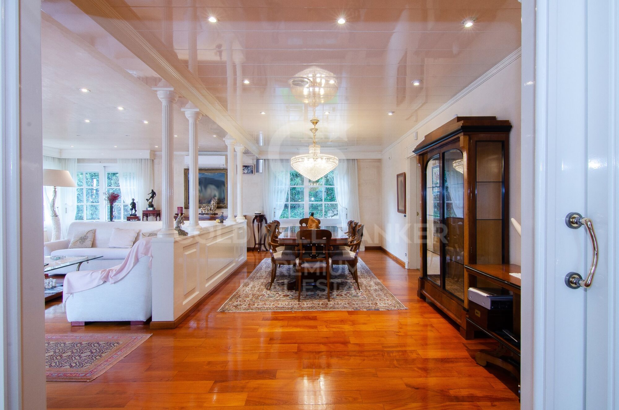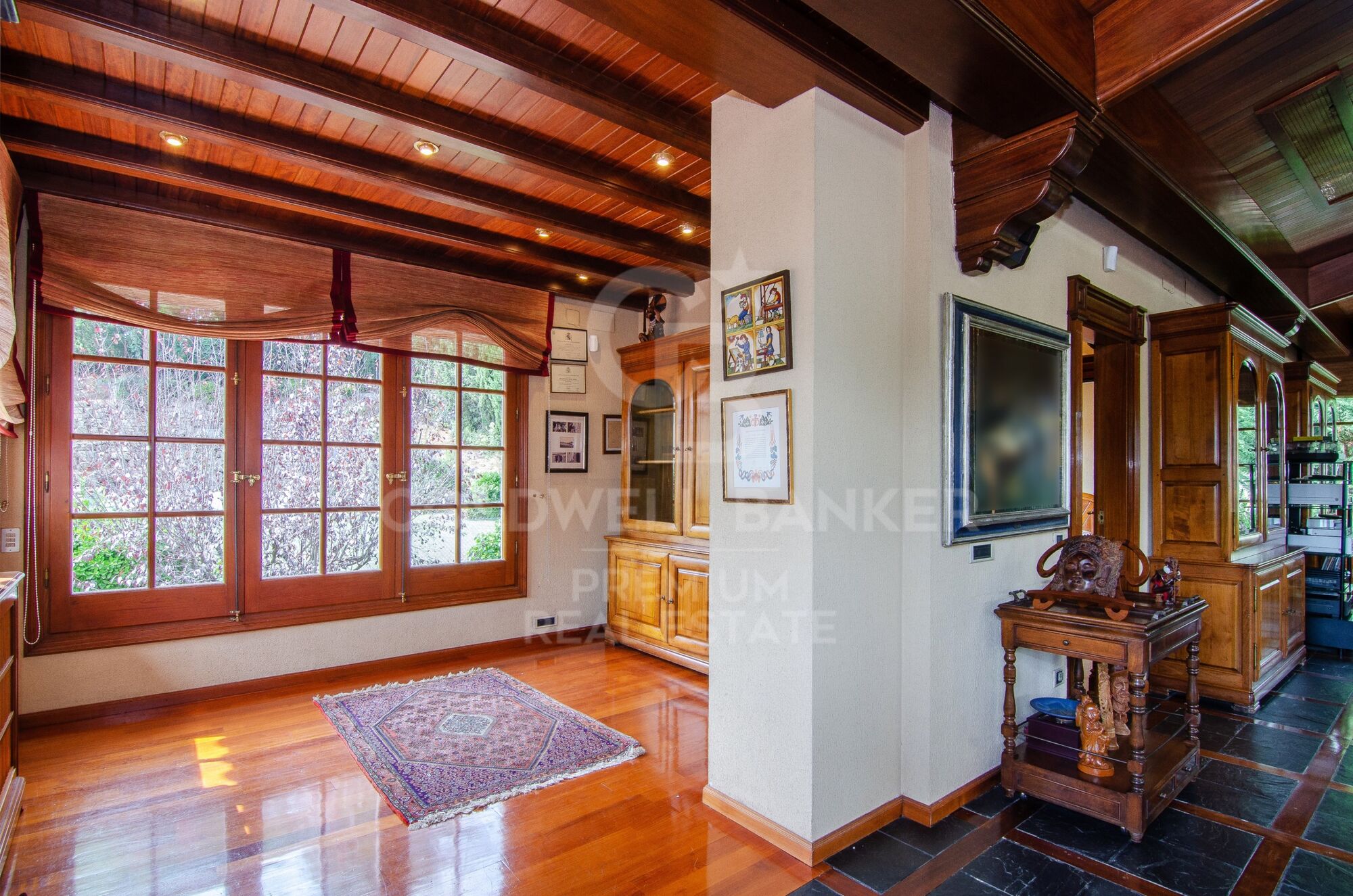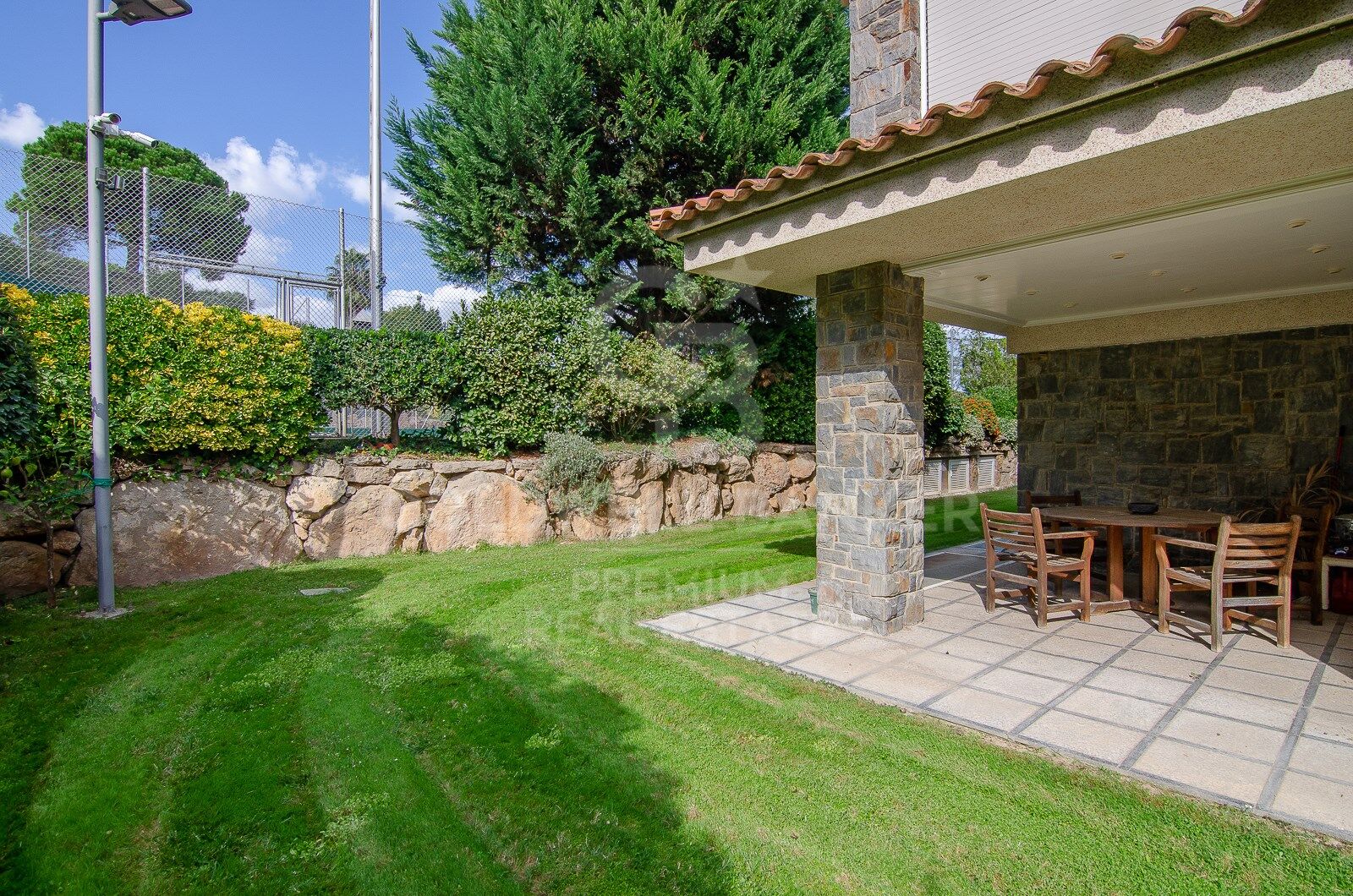 La maison a été entièrement rénovée en 1992, l'agrandissant et lui donnant la forme, le style et les caractéristiques actuels. Nous entrons par le hall où se trouve un élégant escalier en bois de forme incurvée. Il nous donne accès au rez-de-chaussée, tout avec un plancher de bois naturel, où nous trouvons un salon impressionnant avec cheminée et de grandes fenêtres, d'où vous dominez toute l'extension de la propriété. Il a un accès immédiat au jardin qui entoure toute la maison. La salle à manger communique avec la magnifique cuisine et à son tour avec le bureau et la buanderie et une sortie arrière avec une délicieuse terrasse idéale pour le petit-déjeuner, qui vous permet de profiter du jardin disposé autour du périmètre. De l'autre côté, en montant les escaliers, se trouve la zone nuit. Il dispose d'un grand couloir qui distribue 3 grandes chambres doubles, l'une d'entre elles en suite et les deux autres partageant une salle de bain. Enfin, nous trouvons une suite parentale spectaculaire avec salle de bain, dressing, salon privé avec cheminée et accès au jardin surmonté d'un délicieux porche.