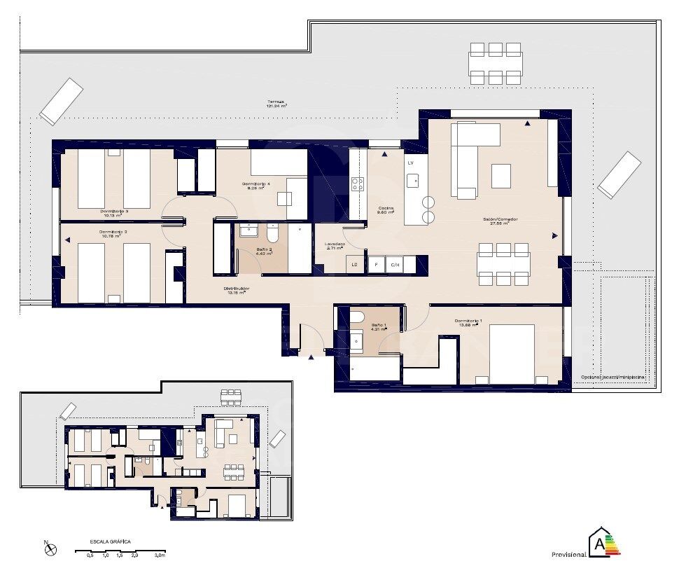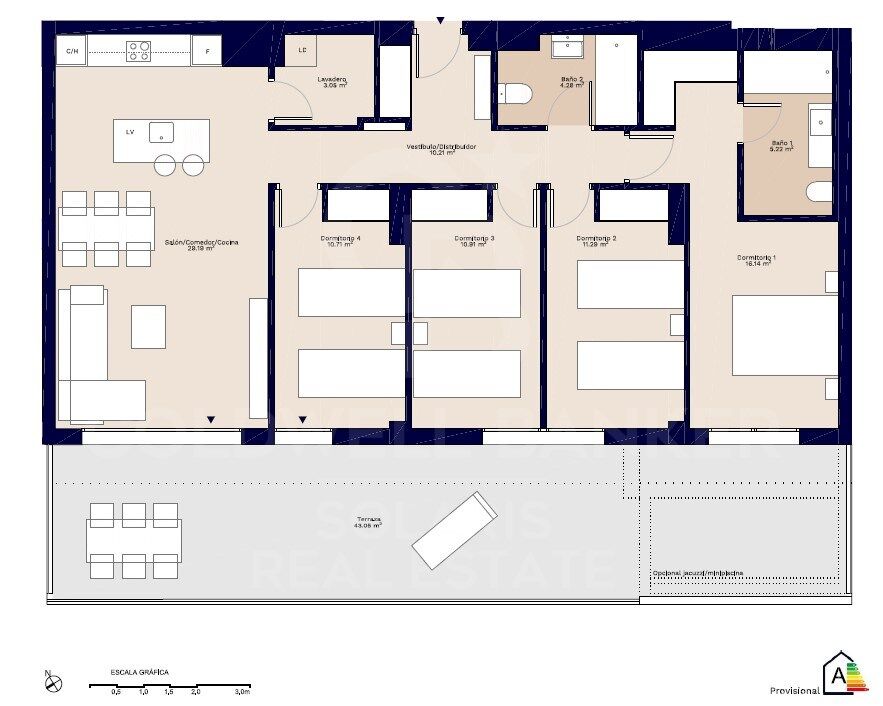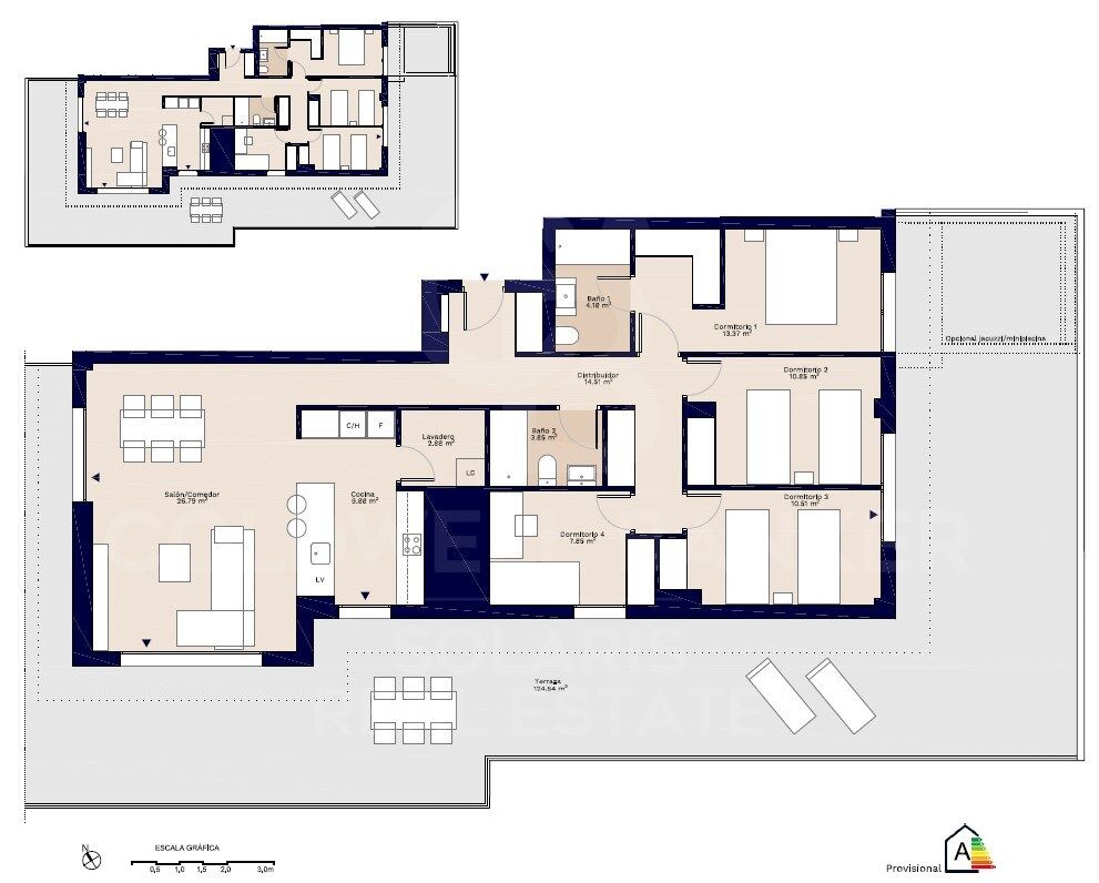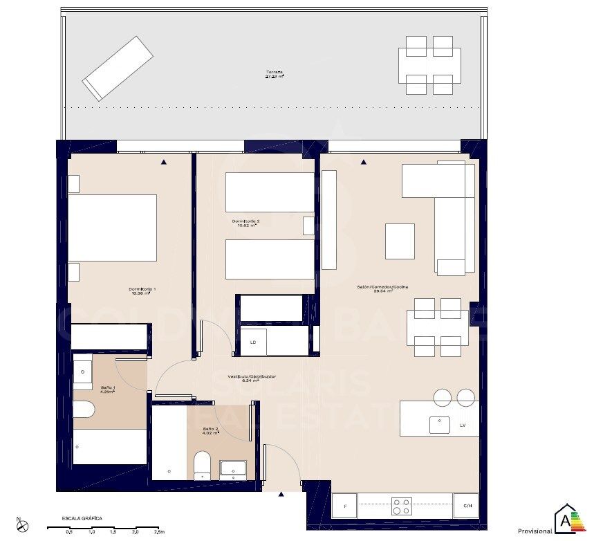 Appartement de nouvelle construction situé dans le développement Victoria IV à Dénia, composé de 2 chambres et 2 salles de bains. Il s'agit d'une maison conçue avec des critères de qualité, de fonctionnalité et d'efficacité énergétique, idéale à la fois pour la résidence habituelle et l'investissement. Le salon est spacieux et lumineux, avec de grandes fenêtres qui donnent un accès direct à la terrasse, vous permettant de profiter d'une excellente ventilation transversale et d'une lumière naturelle abondante. Les stores extérieurs sont motorisés dans le salon et les chambres, apportant confort et isolation. La cuisine est entièrement meublée avec des meubles supérieurs et inférieurs, un plan de travail Silestone ou similaire et équipée d'une hotte aspirante, d'une plaque à induction et d'un four électrique. Il est intégré dans la zone de jour, ce qui facilite un aménagement moderne et pratique. La chambre principale dispose d'une salle de bains privative et d'armoires encastrées entièrement doublées, avec tiroirs, étagères et barre suspendue, ainsi que d'un éclairage intérieur LED. La deuxième chambre dispose également d'une armoire intégrée. Les deux salles de bains sont équipées de sanitaires suspendus en porcelaine vitrifiée, de receveurs de douche plats avec écrans et de lavabos sur une armoire à miroir. Les qualités exceptionnelles comprennent une menuiserie extérieure en PVC à rupture de pont thermique et un vitrage de type Climalit à faible émissivité, un sol en porcelaine dans toute la maison et des murs en peinture plastique lisse. La porte d'entrée est blindée pour plus de sécurité. La climatisation est réalisée par pré-installation d'une climatisation canalisée, et la production d'eau chaude sanitaire est réalisée par un système aérothermique, qui offre une solution énergétique efficace et respectueuse de l'environnement. L'urbanisation dispose de grands espaces communs paysagers, d'une piscine commune, d'un espace pour enfants et d'espaces de loisirs. La maison comprend une place de parking avec pré-installation pour la recharge des véhicules électriques, ainsi qu'une connexion avec interphone vidéo depuis l'entrée principale et l'accès au couloir. Disponible de 315 000 € à 399 000 €, selon le type et l'étage. Une propriété qui allie qualité, design moderne et durabilité dans l'un des meilleurs quartiers résidentiels de Dénia, à proximité des supermarchés, des écoles, des services et à quelques minutes des plages. #ref:CBS518