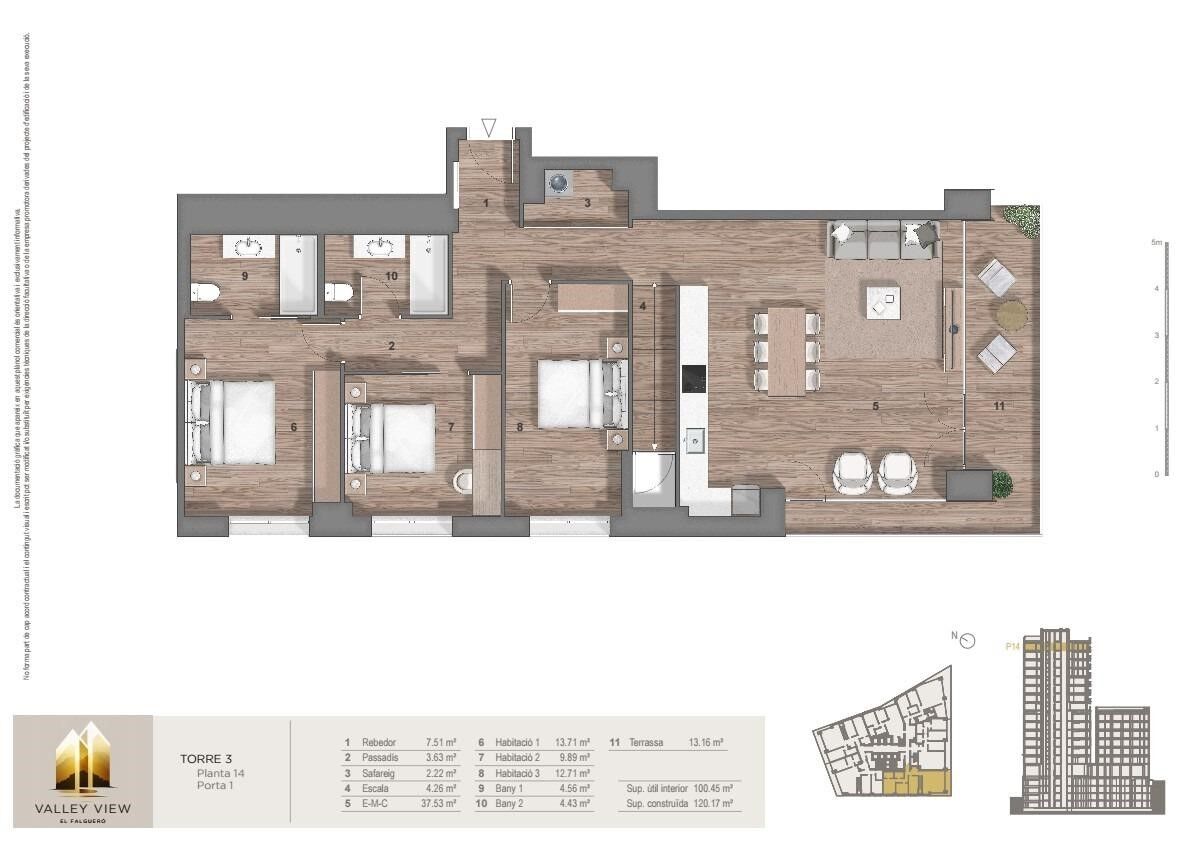 Lotissement exclusif au centre d'Escaldes-Engordany, à 500 mètres du centre économique et social de la Principauté.~~C'est un appartement de 123 m2 plus 47 m2 de terrasse. Il se compose de 3 chambres. Une suite double et les deux autres normales. Tous avec armoires intégrées. Cuisine ouverte sur la salle à manger et espace buanderie pratique.~~Situées dans une enclave unique, ses maisons auront des vues panoramiques spectaculaires sur la vallée d'Andorre et Escaldes, et du soleil toute l'année.~~La deuxième tour du marché, haute de 15 étages, est composée de 68 logements de 1 à 4 chambres. Toutes les pièces sont extérieures, avec des terrasses périmétriques.~~Vous trouverez des maisons de différents types et longueurs, très lumineuses et fonctionnelles, avec un design moderne, des terrasses périmétriques et des finitions haut de gamme.~~Il convient de noter dans cette promotion les fantastiques espaces communautaires avec piscine intérieure chauffée, salle de sport, jardins et solarium (à l'usage exclusif des propriétaires). Les propriétaires pourront également profiter d'un accès direct exclusif aux sentiers Falgueró et Rec del Solà.~~En ce qui concerne les FINITIONS ET LES QUALITÉS des maisons, nous soulignons :~- MENUISERIE EXTÉRIEURE en aluminium à rupture de pont thermique type SCHUCO ou similaire.~- Triple vitrage avec double chambre à air adaptée aux besoins énergétiques.~- Sol en grès, avec deux options de finition au choix du client.~- armoires encastrées de la marque Carré ou similaire~- CUISINES ouvertes avec plan de travail Neolith, Silestone ou similaire, équipées d'une hotte aspirante de surface de type 'BORA' intégrée dans la plaque de cuisson, la plaque à induction, le four, le micro-ondes, le réfrigérateur et le lave-vaisselle de SIEMEMS ou similaire. Éléments muraux et bas de la marque Santos ou similaire, combinant une couleur unie avec une finition imitation bois. Robinet extensible.~- SALLES DE BAINS aux murs recouverts de céramique de qualité supérieure. Equipé de meuble avec tiroir et évier encastré. Robinets de réglage Hansgrohe ou similaires, cloison en verre et miroir. Douche intégrée effet 'pluie'~- CLIMATISATION ET RENOUVELLEMENT :~ * Système de production ACS et climatisation centralisée relié à~ ÉCOTERME FEDA.~ * Système de chauffage au sol dans toute la maison.~ * Climatisation à air froid dans toute la maison sauf dans les salles de bains, par~ conduits d'air intégrés au faux plafond avec soufflage et extraction.~ * Renouvellement d'aérateur avec système double flux avec équipement compact~ avec Siber ou récupérateur de chaleur de marque similaire.~ pour chaque maison.~- INSTALLATION ÉLECTRIQUE:~ * Spots intégrés au faux plafond dans les salles de bain, buanderie et cuisine.~ * Eclairage à bande LED dans le couloir et les autres pièces.~ * DOMOTIQUE : système de climatisation domestique.~~Avec la possibilité d'acheter des places de parking et des débarras dans le même bâtiment.~~N'hésitez pas à nous contacter pour clarifier vos questions et avoir des informations supplémentaires.~~Date d'achèvement prévue : dernier trimestre 2027. #ref:04104/5210