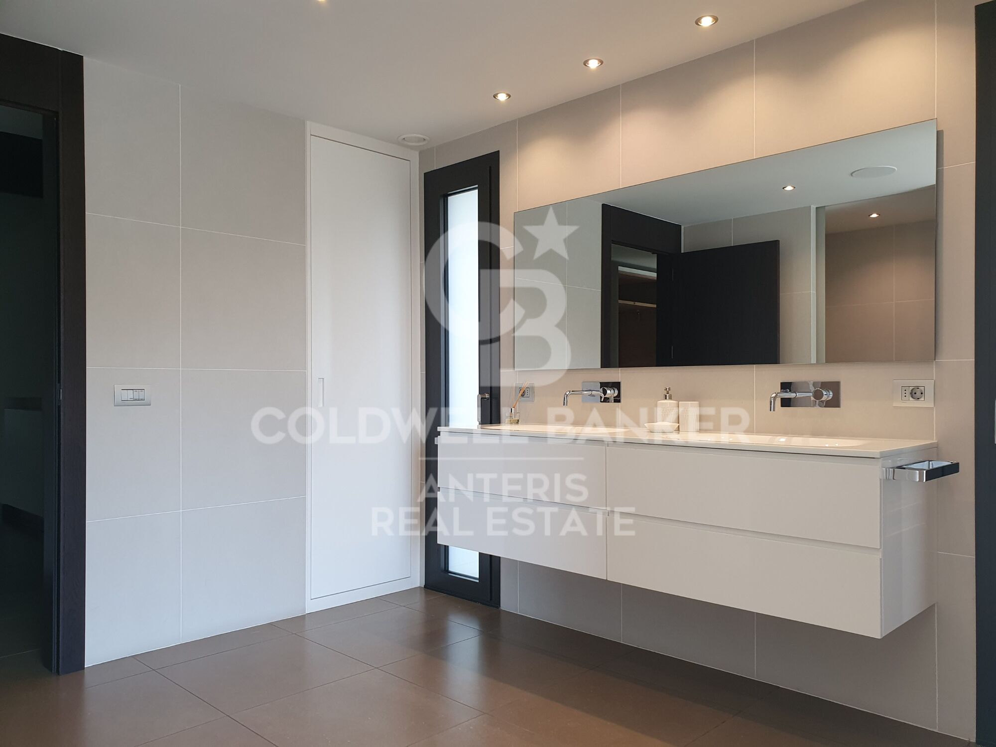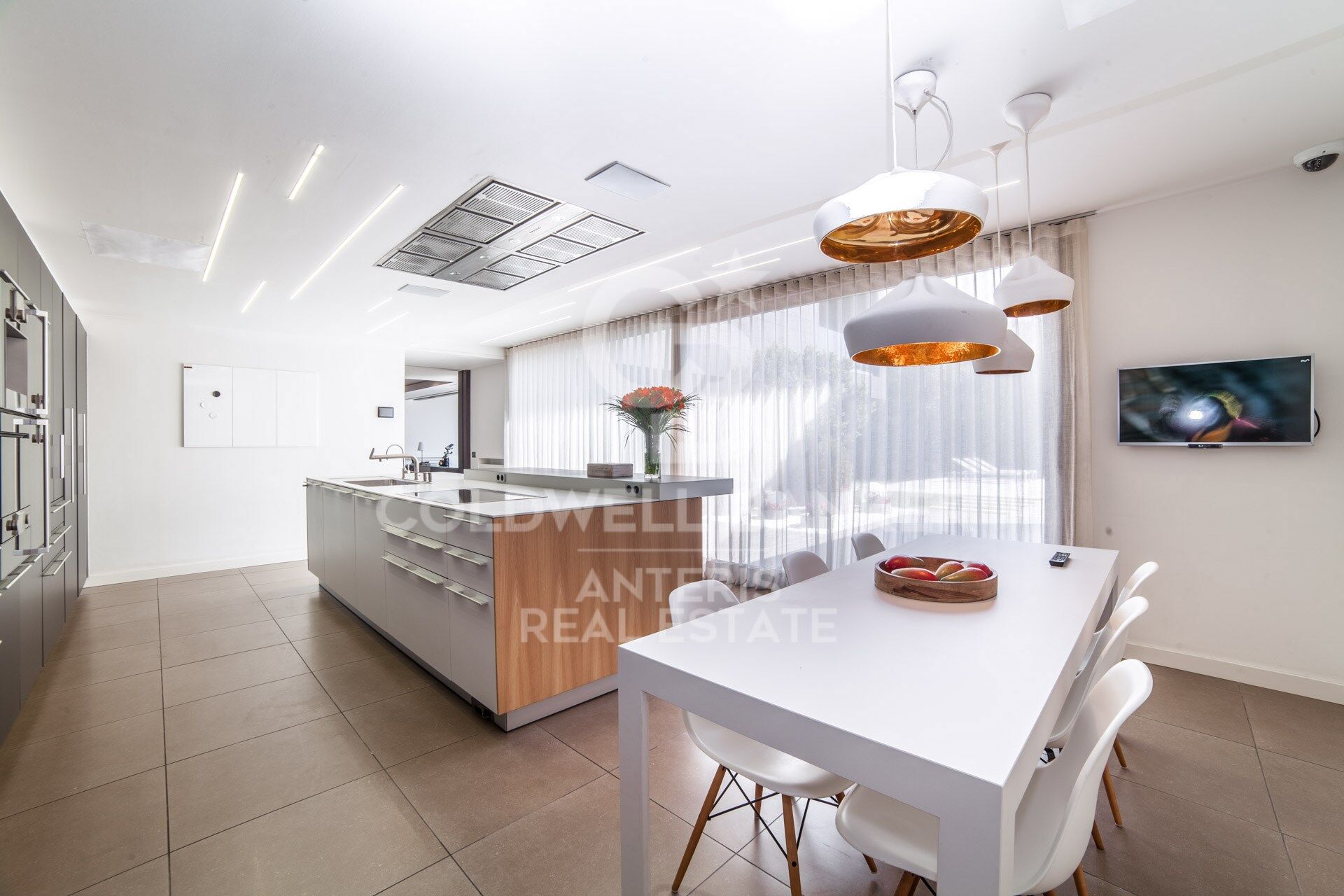 On the first floor, an imposing double-height living-dining room with gas fireplace creates a cozy and elegant atmosphere. The kitchen with island, with direct access to the infinity pool, is a perfect place for culinary creativity. The night area, separated from the day area ensuring comfort and privacy, offers three double bedrooms en suite, a playroom with bathroom and the master suite with dressing room and Jacuzzi, with direct access to the pool and large windows overlooking Barcelona.