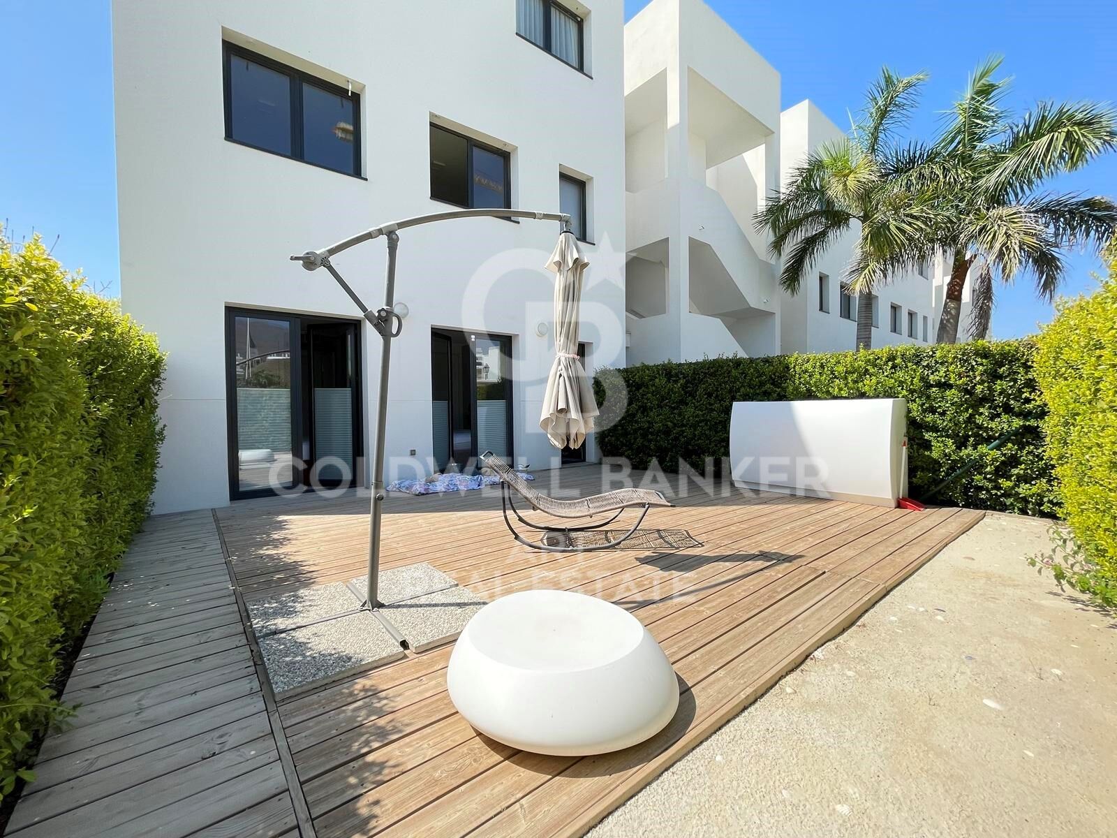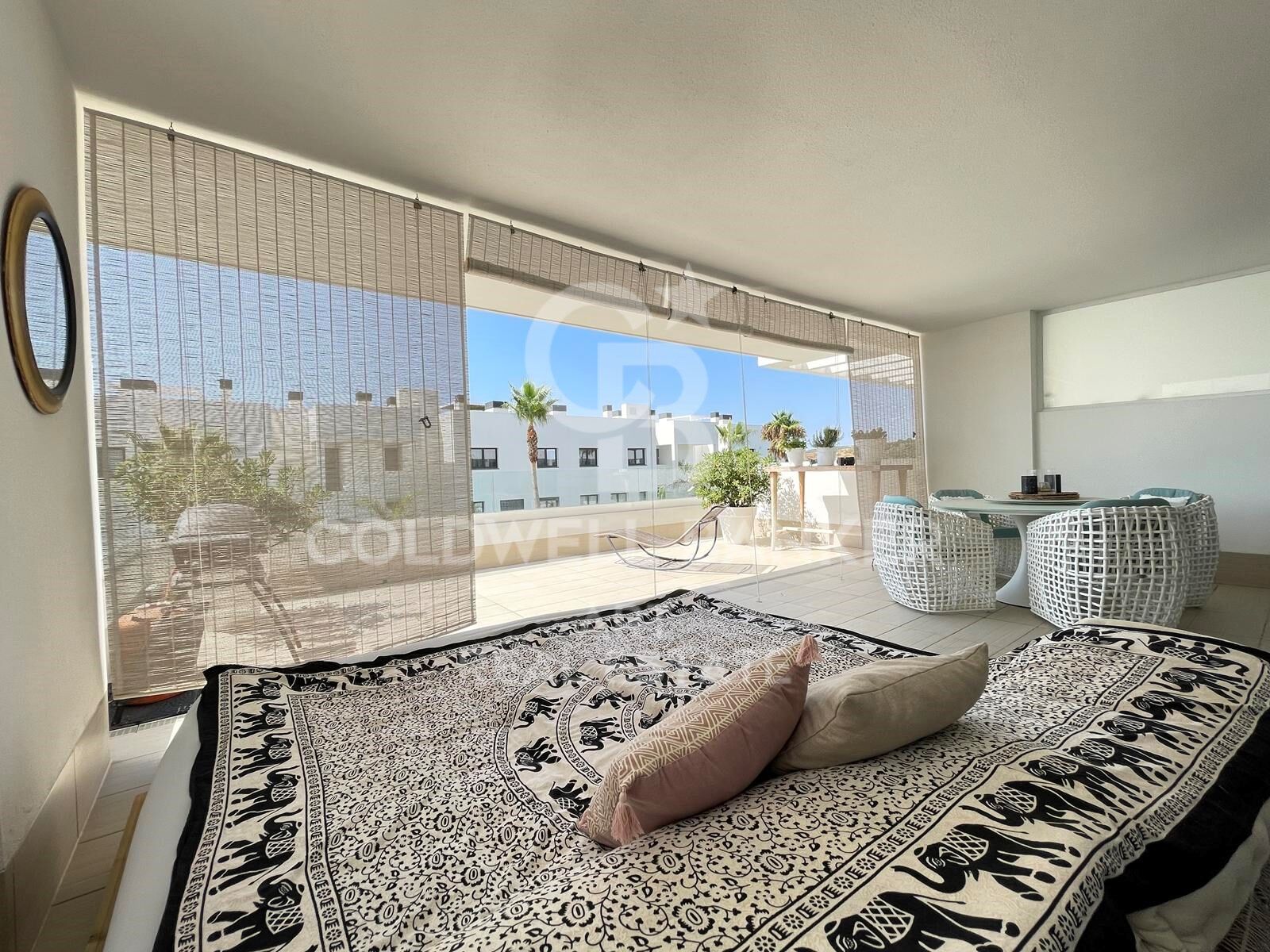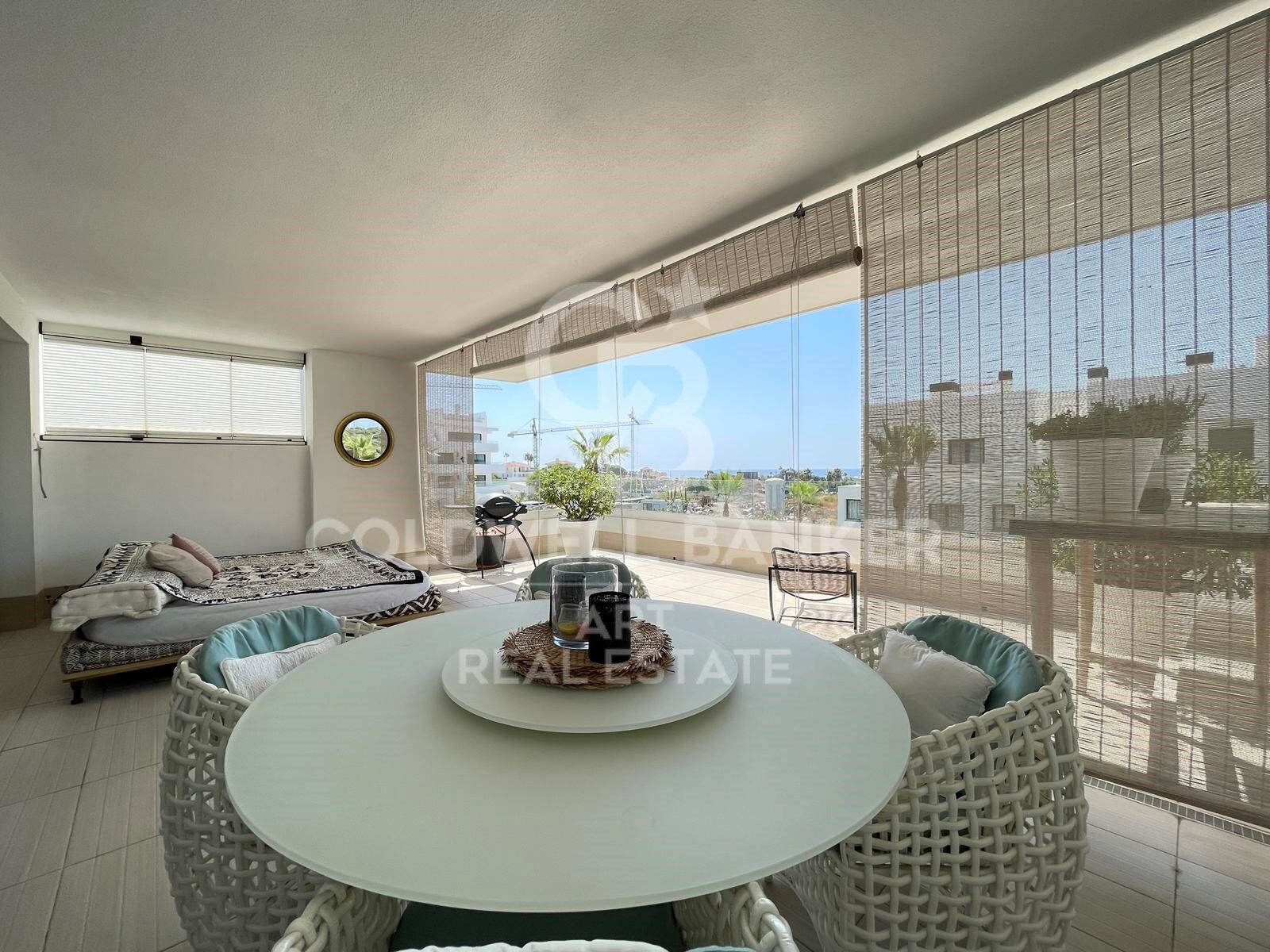 L'appartement dispose de deux chambres et de deux salles de bains, ce qui le rend idéal pour les familles et les couples qui apprécient l'espace et la fonctionnalité. Il dispose d'une terrasse privée de 45 m² et d'un patio au rez-de-chaussée de 45 m² supplémentaires, parfait pour profiter du soleil, du climat méditerranéen et d'agréables vues partielles sur la mer.