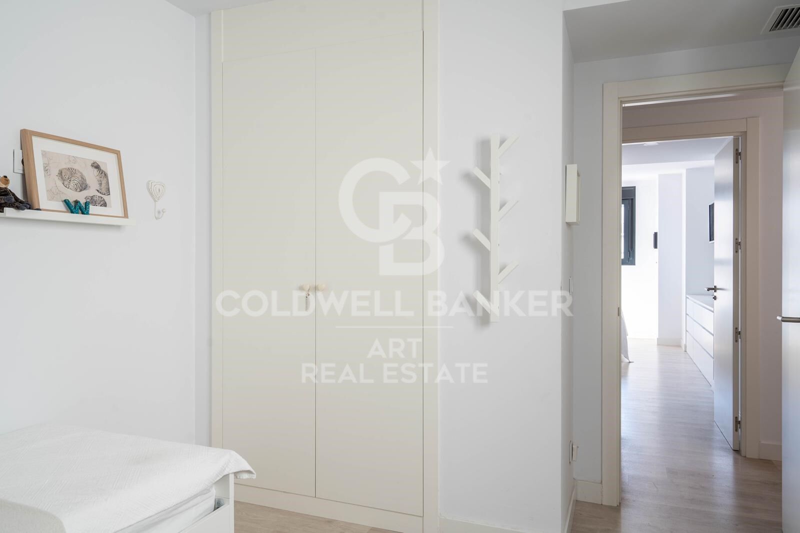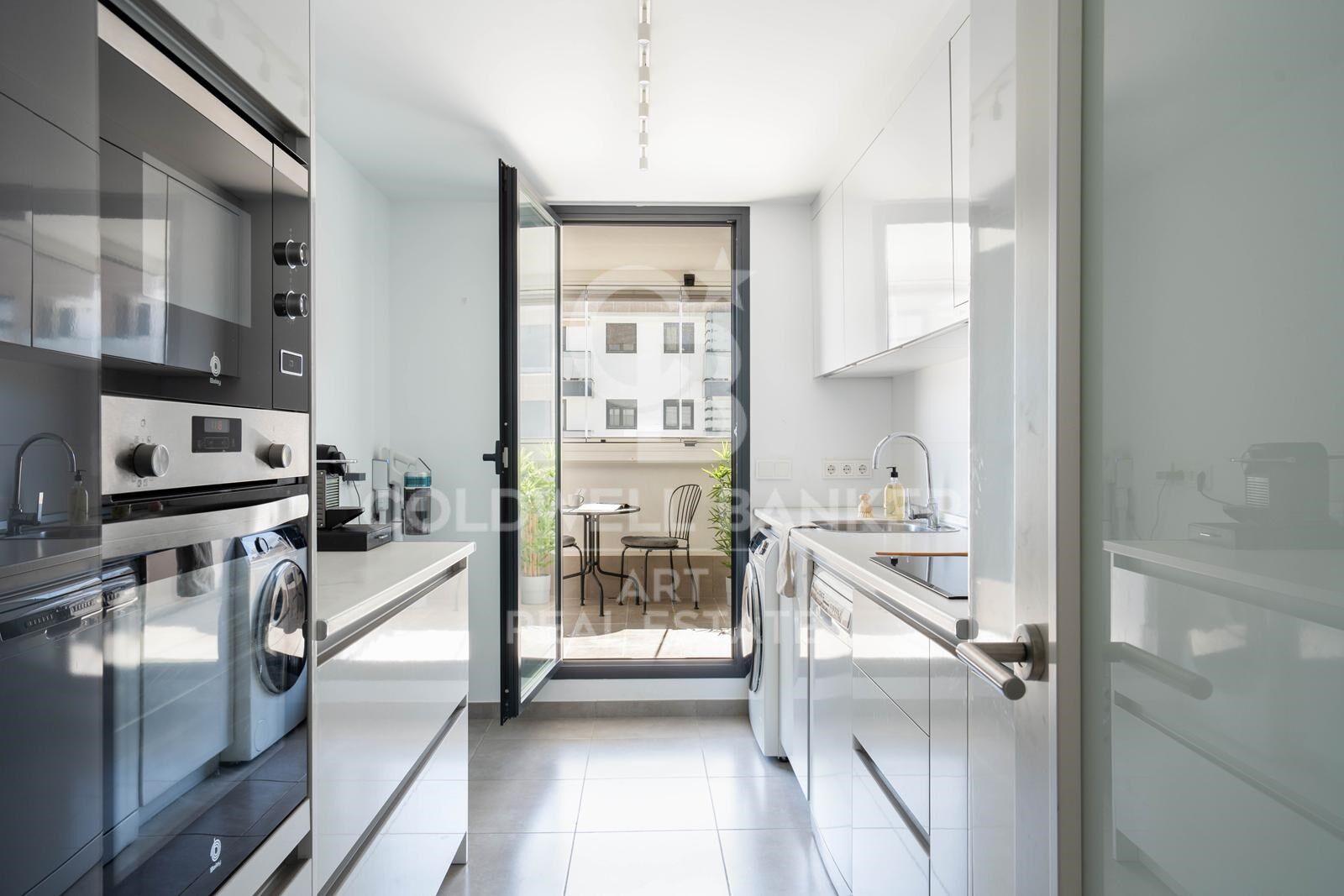 L'appartement dispose de parquet, carrelage en grès cérame, espaces ouverts lumineux, et une cuisine entièrement équipée avec électroménagers intégrés. Une des deux salles de bains est dotée d'une baignoire hydromassante. Il est également équipé de placards intégrés, climatisation, double vitrage, garage privé et débarras.