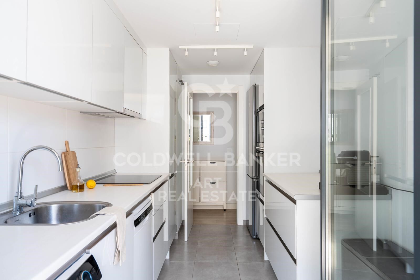 La terrasse privée comprend une élégante véranda vitrée avec vue sur les jardins et la ville. La toiture de l'immeuble offre une magnifique piscine commune avec solarium et vues panoramiques sur la mer et les montagnes, parfaite pour se détendre ou recevoir.
