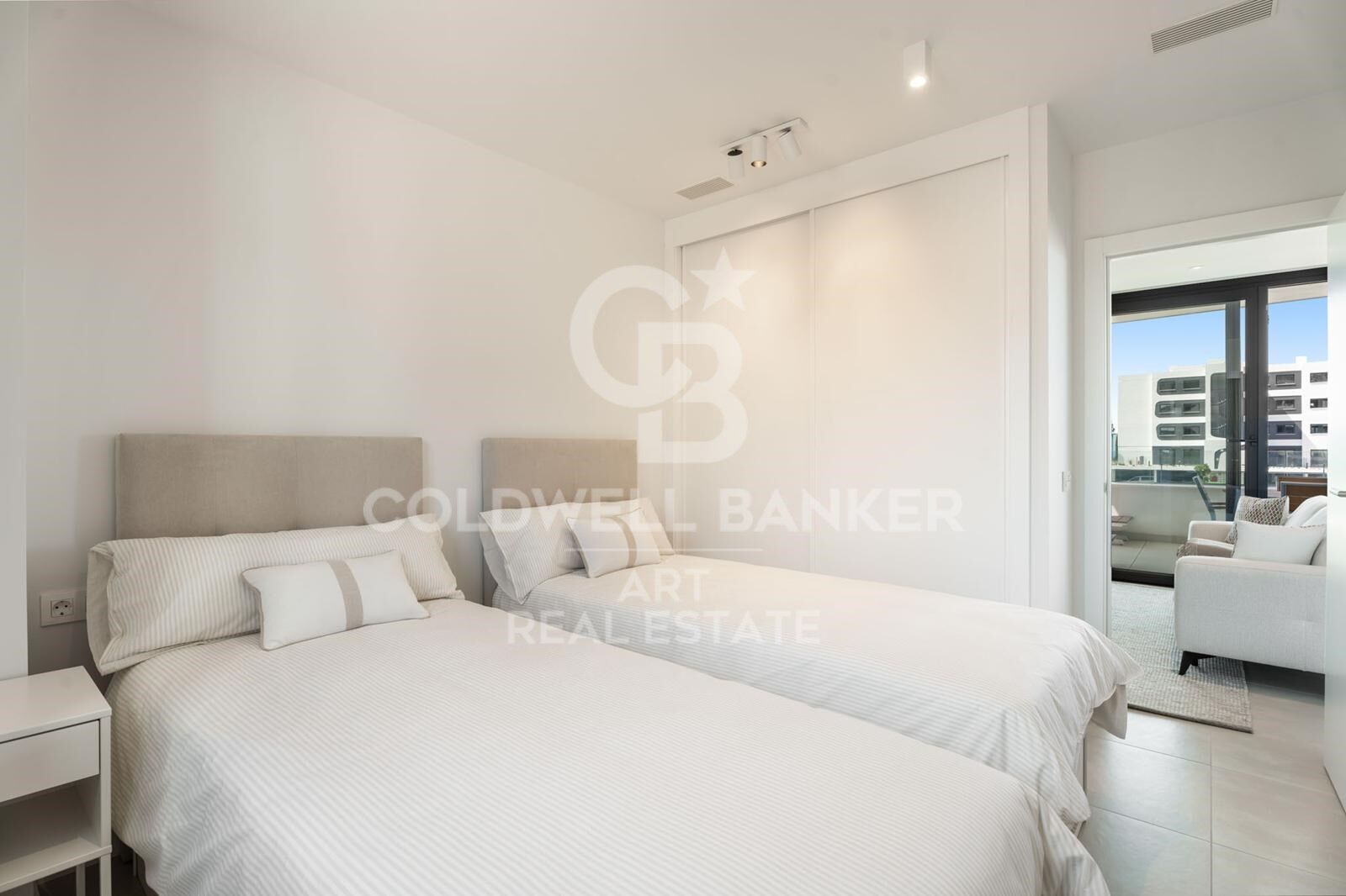 Le plan ouvert relie harmonieusement la cuisine entièrement équipée, la salle à manger et le salon. De grandes baies vitrées coulissantes donnent accès à des espaces extérieurs privés avec une vue partielle sur la Méditerranée. La cuisine est équipée d'appareils électroménagers intégrés et de meubles contemporains, tandis que l'ensemble de l'appartement reflète un design moderne avec des matériaux neutres et durables.