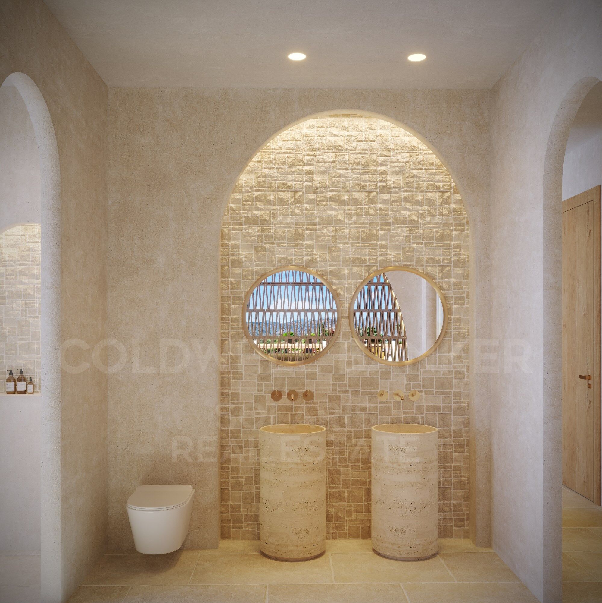 L'intérieur raffiné de la villa est doté de microciment dans les salles de bains et sur tous les sols, ainsi que de fenêtres en aluminium double vitrage de couleur oxydée. Les chambres disposent de volets électriques extérieurs et les salles de bains de robinetterie noire, conférant une touche moderne et élégante.