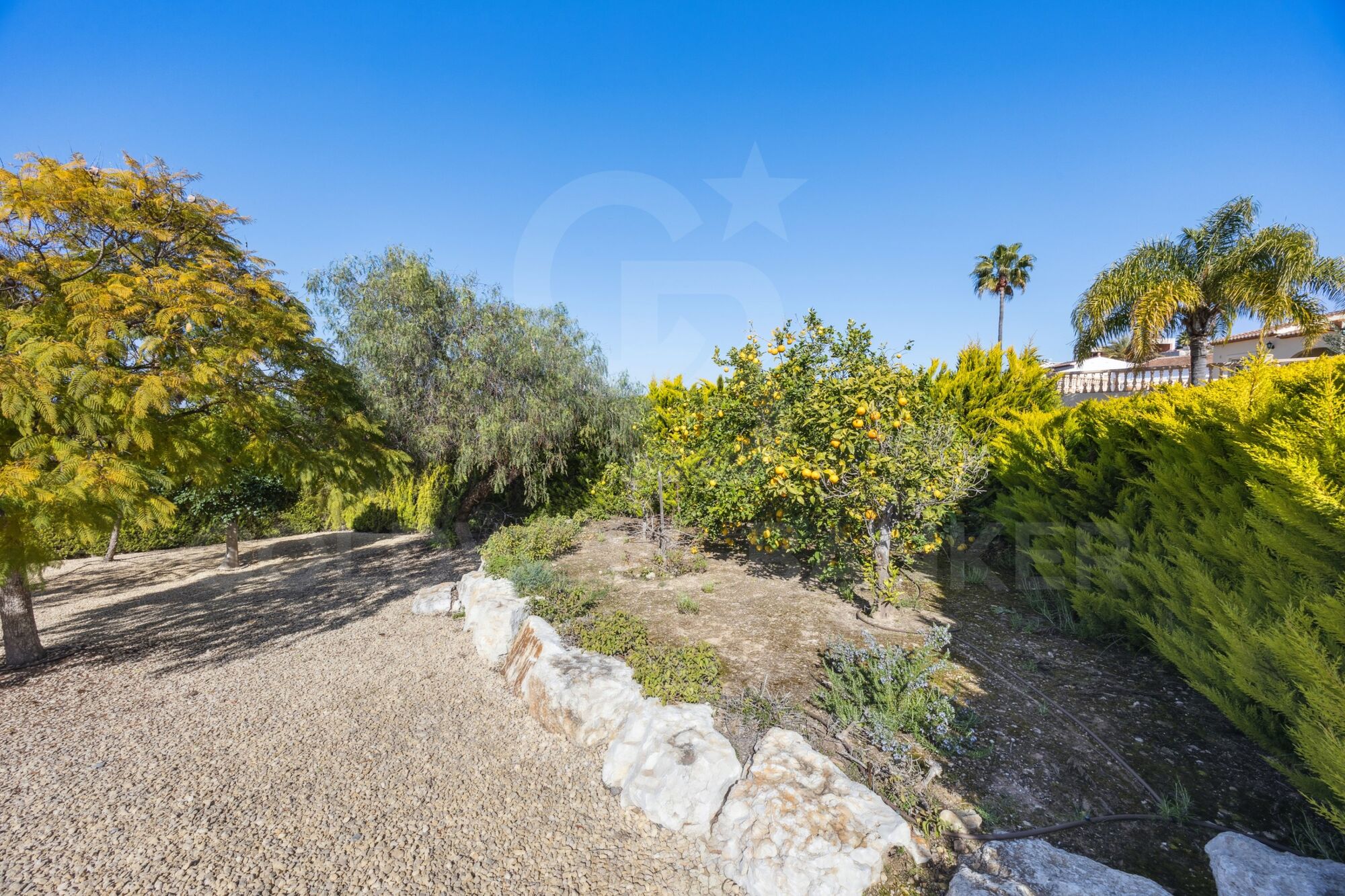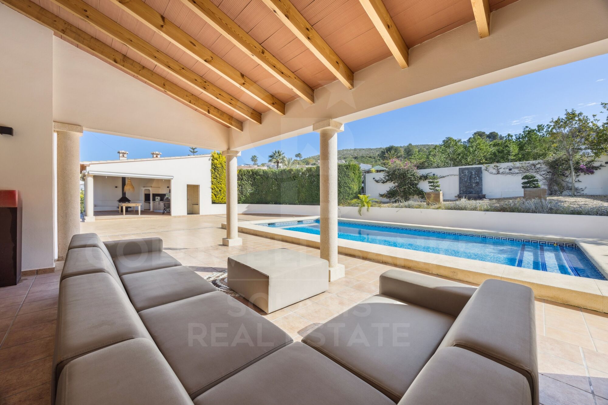 La maison présente des pièces de taille généreuse, tous les espaces de vie principaux étant idéalement situés sur un seul niveau. Un salon et une salle à manger décloisonnés se prolongent de manière transparente vers une naya spacieuse, offrant une vue pittoresque sur la piscine et les jardins magnifiquement aménagés. La cuisine séparée, avec une buanderie, offre la possibilité d'un design à aire ouverte si vous le souhaitez.
