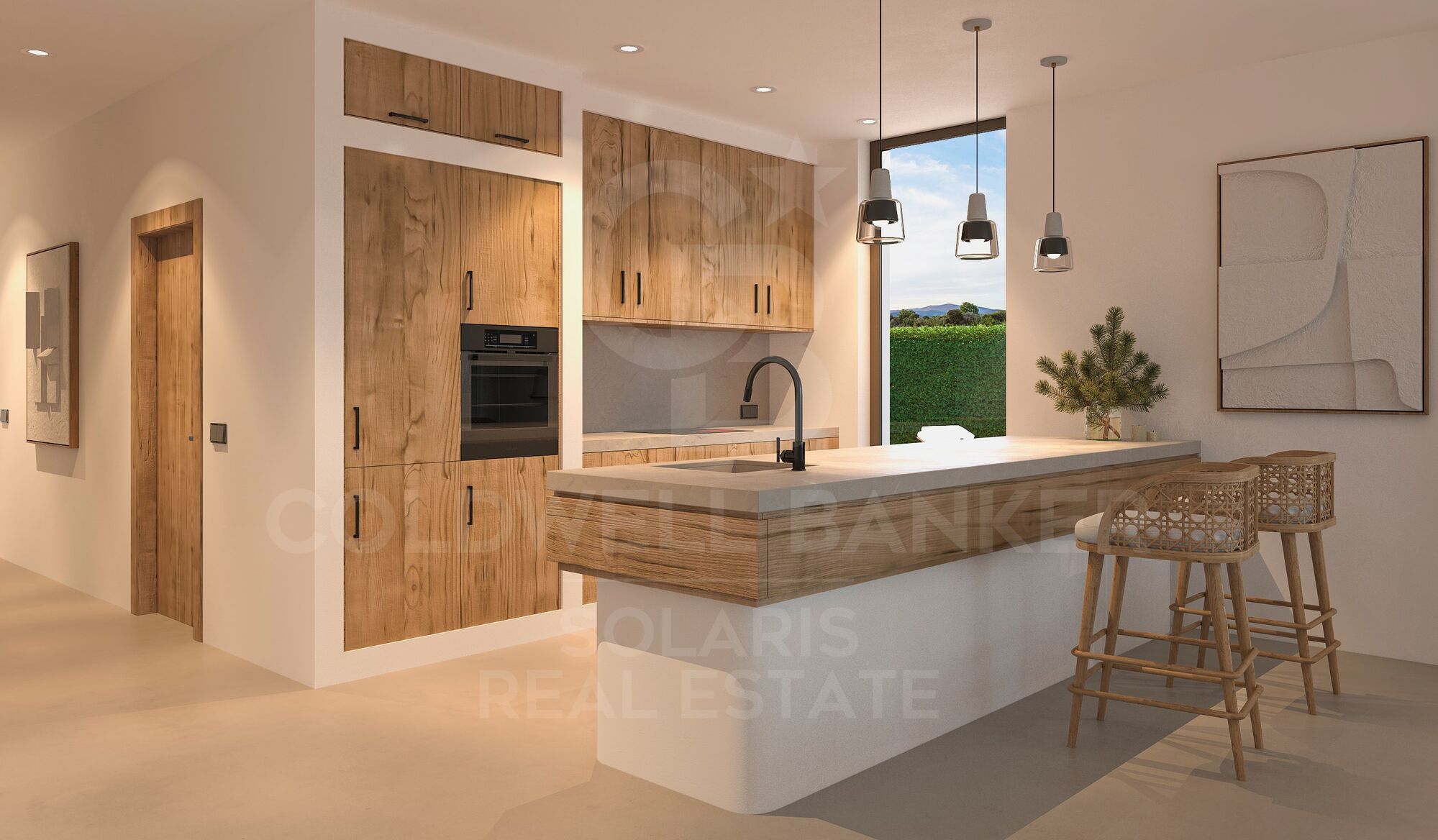 Avec une façade blanche et des coins arrondis, rehaussée par la beauté naturelle des pierres de Montgó taillées à la main avec des reflets rouges, son design méditerranéen invite à la contemplation et à la jouissance de chaque espace. Le micro-ciment dans les salles de bain et sur l'ensemble du sol intérieur, complété par des fenêtres en aluminium à double vitrage de couleur rouille, se conjuguent pour créer une atmosphère de luxe et de confort. Les chambres disposent de volets électriques extérieurs et les salles de bain de robinetterie noire, apportant une touche moderne et élégante.