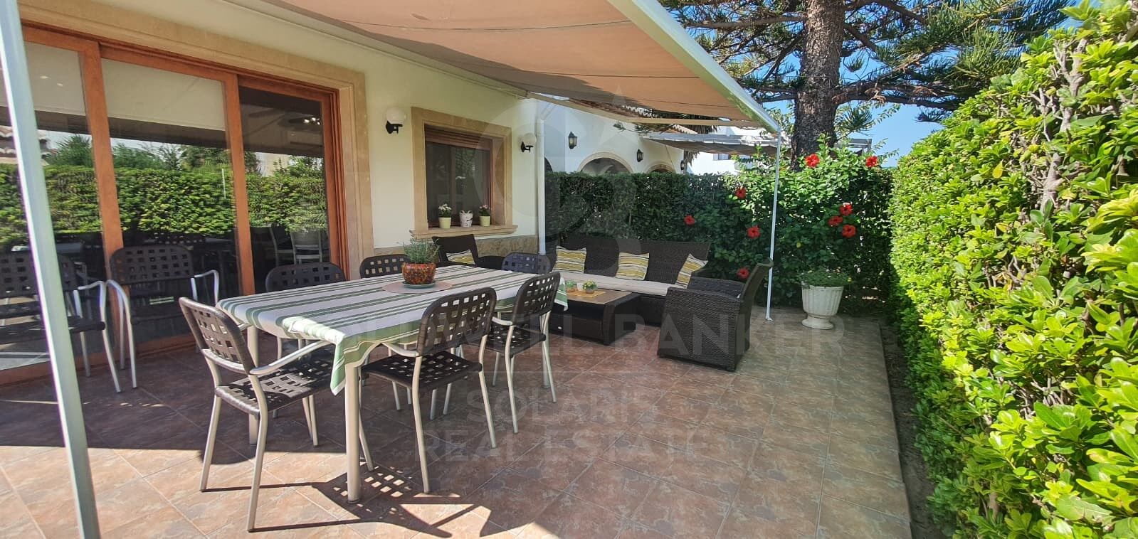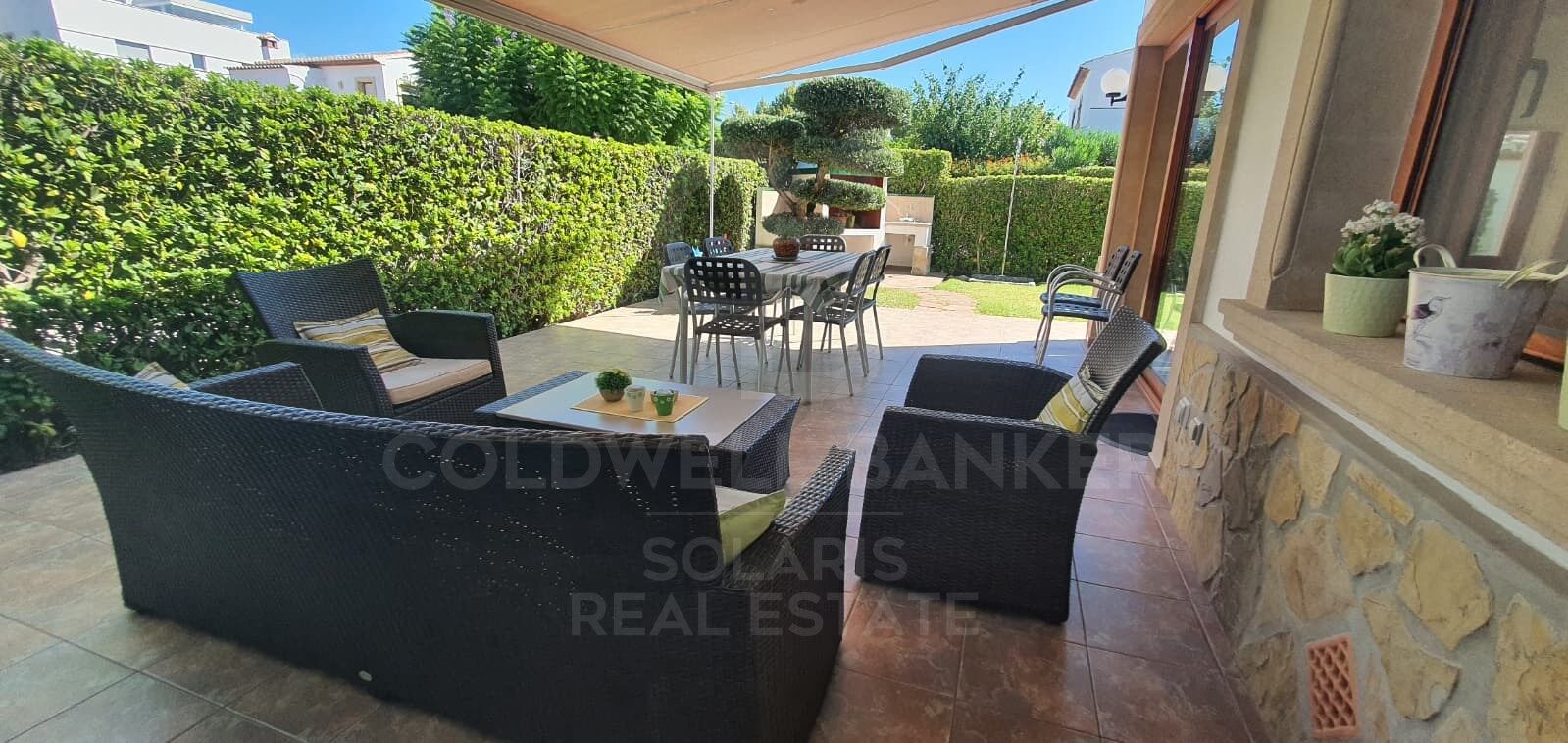 Terraza con zona chill out: sofás, comedor exterior, toldo extensible y barbacoa