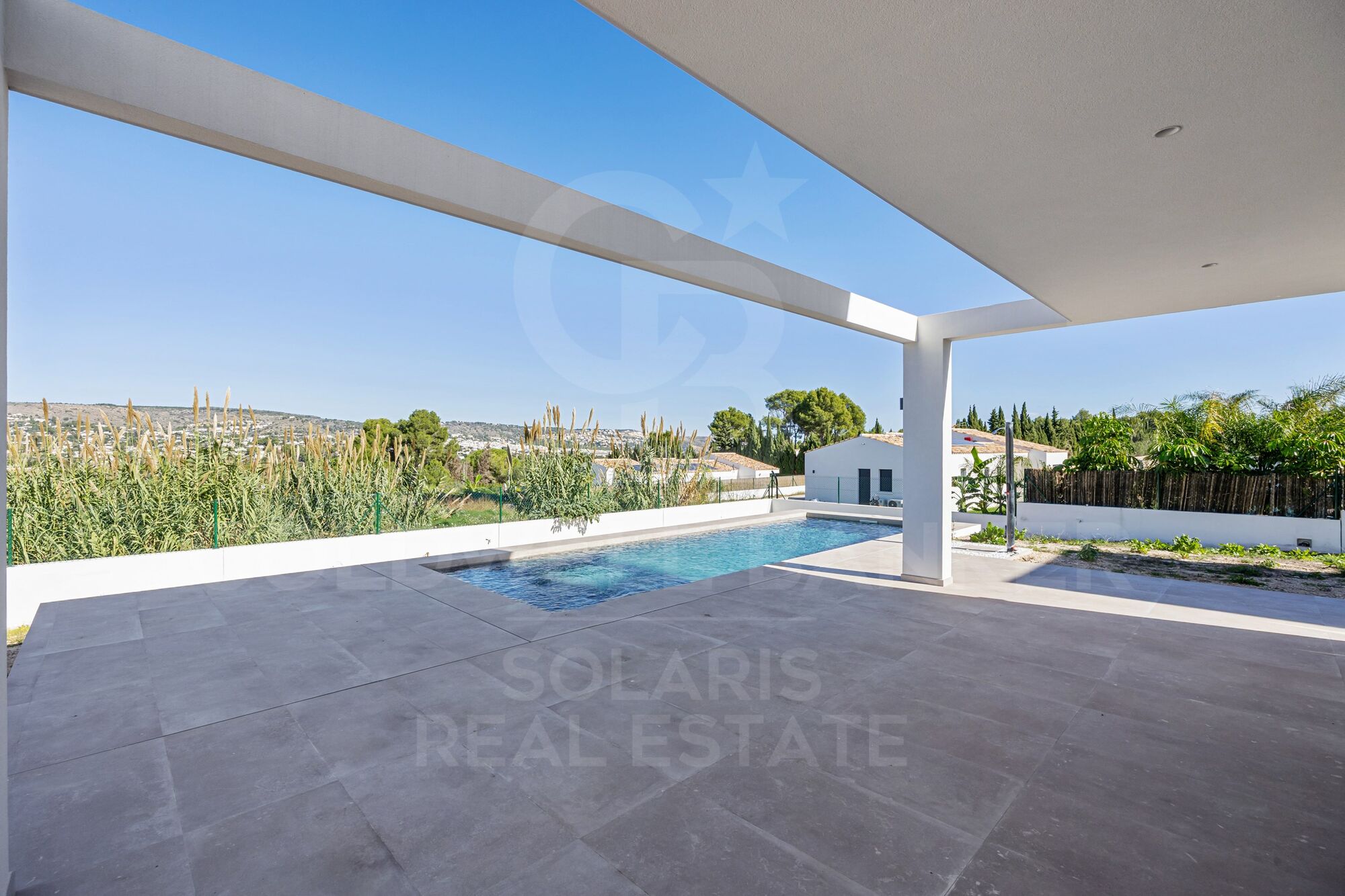 La villa dispose d'une piscine moderne de 4 x 10 mètres, parfaite pour se détendre et profiter du climat méditerranéen. Depuis la terrasse partiellement couverte, vous pourrez profiter d'une vue imprenable sur la montagne du Montgó, créant ainsi une atmosphère extérieure sereine.