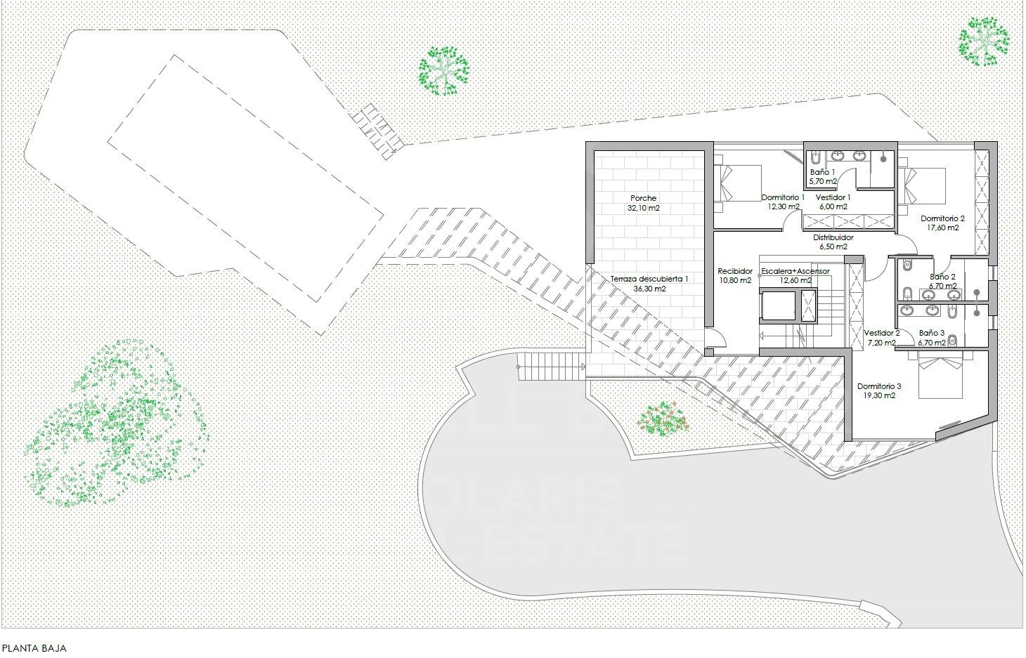 Le rez-de-chaussée se distingue par une terrasse couverte de 36m2, accompagnée de 3 chambres confortables et de 3 salles de bains luxueuses.