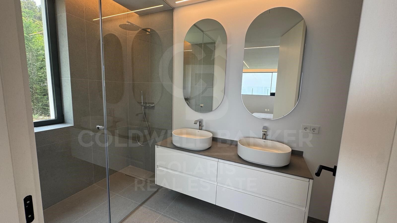 Au premier étage, une majestueuse terrasse de 150m2 se déploie, avec une piscine privée de chloration saline et un système de nage à contre-courant. Le grand salon-salle à manger dispose de fenêtres panoramiques qui encadrent la vue sur la mer Méditerranée et l'île de Portichol. La cuisine ouverte équipée de fins détails en grès cérame s'intègre harmonieusement. De plus, il y a des toilettes invités et l'impressionnante chambre principale avec dressing et salle de bain complète.