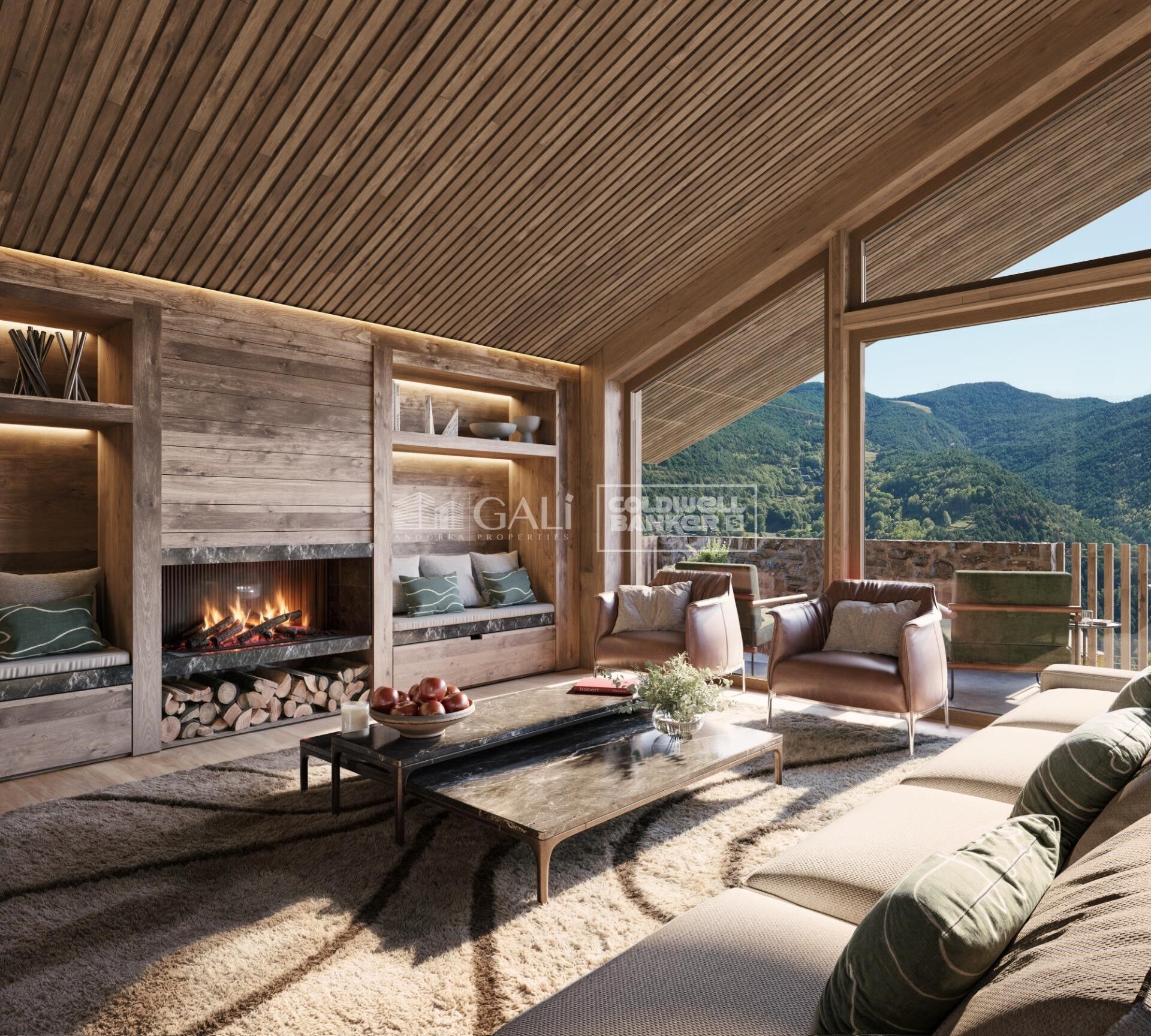 Nous avons le plaisir de vous présenter le nouveau projet immobilier « LES LLARS DE LA FONT », un projet résidentiel exclusif composé de 3 élégantes maisons situées dans un endroit fantastique à La Massana, dans le centre historique de Sispony. Elles sont soigneusement placées dans la rue principale. Leurs façades en pierre et en bois s'intègrent à la montagne et aux limites traditionnelles du village.~Elles sont conçues pour être économes en énergie et utilisent les dernières technologies et techniques de construction afin de minimiser l'impact sur l'environnement et d'utiliser les ressources de manière responsable. Ce sont des maisons qui tirent le meilleur parti de la lumière naturelle, qui sont isolées des intempéries et du bruit extérieur, qui sont ventilées de manière contrôlée, ce qui permet d'obtenir un niveau élevé de confort et de bien-être, ainsi qu'une excellente qualité de l'air et un environnement intérieur sain, tout en consommant le moins d'énergie possible et en atteignant donc la classe énergétique maximale A.~~Cal Tallareta, a une surface construite de 559m2 dont 105m2 de terrasses. En outre, il partage avec les 2 autres unités de la promotion, un jardin de 384m2.~Il est divisé en 3 étages plus sous-sol, communiqués par ascenseur et escaliers.~- Étage 0 : Comprend un grand hall d'entrée menant à la spectaculaire zone de jour, comprenant un spacieux salon-salle à manger avec une cuisine design ouverte entièrement équipée. Il y a également des toilettes pour les invités. Cet étage est conçu pour profiter de la famille et des amis et pour donner une sensation de chaleur et d'espace, l'espace a de grandes fenêtres qui garantissent l'entrée du soleil et de la lumière naturelle, à travers sa première terrasse.~- Étage -1 : Composé de l'espace nuit. Il se compose de 3 grandes chambres doubles, toutes en suite, avec des armoires encastrées et un accès à la deuxième terrasse de la maison.~- Etage -2 : pour cet étage, il y a deux options de distribution~ A : une suite parentale avec dressing et salle de bains complète avec un merveilleux espace spa. ~ B : une suite avec dressing et salle de bains et une salle polyvalente qui peut être utilisée comme gymnase, salon...~ Dans les deux cas, l'accès à la troisième terrasse de la maison est toujours possible. Cet étage dispose également d'un espace buanderie confortable.~- Etage - 3 : C'est ici que se trouve le garage pouvant accueillir 4 voitures. A cet étage, il y a également une salle de stockage.~~Toutes les pièces de la maison ont un accès direct à trois grandes terrasses orientées au sud-est qui garantissent un ensoleillement énorme et d'excellentes vues panoramiques.~Les maisons sont équipées d'un système de réutilisation des eaux de pluie et l'eau chaude sanitaire est produite au moyen d'un système aérothermique très efficace.~En ce qui concerne les qualités de l'aménagement, des matériaux naturels de proximité sont utilisés, tels que des murs maçonnés en pierre et des tuiles en ardoise, ou des toitures et des charpentes en bois, en évitant l'utilisation de matériaux polluants ou toxiques. ~~Points forts :~- Menuiserie extérieure performante avec vantail caché et triple vitrage à faible émission. Porte d'accès blindée et panneau latéral fixe en placage de bois naturel avec finition en chêne et porte sectionnelle automatisée avec télécommande dans les garages.~- Terrasses avec dalles antidérapantes en pierre naturelle, garde-corps en pierre naturelle ou en acier revêtu. Jardinières et mains courantes en acier rouillé sur les terrasses. Clôtures de jardin en maçonnerie de pierre naturelle.~ Revêtements intérieurs de haute qualité, peinture, pierre naturelle, acier, bois ou grès cérame rectifié, selon la conception et la décoration.~- Revêtement de sol général en bois ou en grès cérame rectifié dans les salles de bains et en béton poli avec résine époxy dans le garage.~- Menuiserie intérieure en placage de chêne avec poignées et ferrures en acier inoxydable mat. Placards aménagés avec vases de plan de travail, portes et façades plaquées pour s'harmoniser avec la menuiserie, avec poignée refondue.~- Cuisine entièrement équipée avec des appareils Bosch de haute qualité, un grand évier Franke en acier inoxydable et un robinet mélangeur extractible Grohe. Meubles bas et hauts haut de gamme avec tiroirs à fermeture progressive et tiroirs robustes, modèle ONE08, finition en Ernestomeda. Plan de travail, façade et tablette en pierre marbrière artificielle.~- Salles de bains avec des matériaux de haute qualité et un design moderne et fonctionnel. Douche avec cabine de douche en pierre artificielle ou, selon l'option choisie, une baignoire avec sauna est également disponible.~- La distribution de l'étage inférieur est flexible et permet de convertir l'étage entier en une fantastique suite de 60m2 ou de combiner une chambre à coucher avec une grande salle polyvalente. La maison peut ainsi être adaptée à différents besoins et modes de vie.~- Cheminée intégrée Stuv modèle C.1~- Casier à skis avec casier, banc et chauffe-bottes~- Aménagement paysager nécessitant peu d'entretien, composé d'arbustes et d'ensemencement hydraulique~- Ascenseur silencieux à travers la maison et ascenseur pour véhicules pour accéder au garage. ~- Pré-installation pour le chargement des véhicules électriques. Porte-vélos avec borne de recharge. Installation photovoltaïque~- Système domotique Jung Smart Home comprenant la passerelle de connexion avec l'aérothermie et la connectivité internet, avec des écrans de contrôle intégrés dans le système de porte d'entrée vidéo. Contrôle de la porte de garage, éclairage, climatisation et production d'eau chaude, sécurité et anti-intrusion avec détecteurs de mouvement, alarme et vidéosurveillance.~- Climatisation par le sol avec chauffage par l