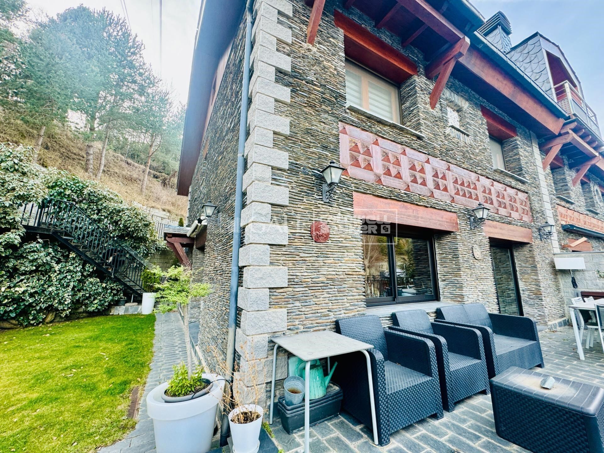 Villa confortable à vendre à La Massana, avec un emplacement privilégié car accessible à pied jusqu'au centre. C'est un chalet aux 3 vents, entouré d'une terrasse et d'un jardin de 271m2.~~La maison, de 384m2 construits, est répartie sur 4 étages, reliés par un noyau d'escaliers et un ascenseur.~- Au 0ème étage, nous trouvons le garage pour 2 voitures, un débarras, une salle des machines et une grande buanderie.~- L'espace jour se situe au 1er étage : un grand hall, une magnifique grande cuisine avec électroménager haut de gamme et un grand séjour avec cheminée. Depuis le salon et la cuisine, vous pouvez accéder à la terrasse/jardin qui entoure la maison.~- Aux 2ème et 3ème étages, nous trouvons la zone nuit, avec 4 chambres doubles, toutes avec placards intégrés. Parmi ces chambres, 2 sont des suites avec salle de bain complète. Les deux autres chambres partagent une salle de bain. Depuis le 2ème étage, on accède également au jardin, qui est relié au jardin du 1er étage par des escaliers.~~Il convient de souligner la qualité des finitions de ce chalet, sa bonne orientation solaire et la taille du jardin qui entoure la maison. N'hésitez pas à nous contacter pour organiser une visite.