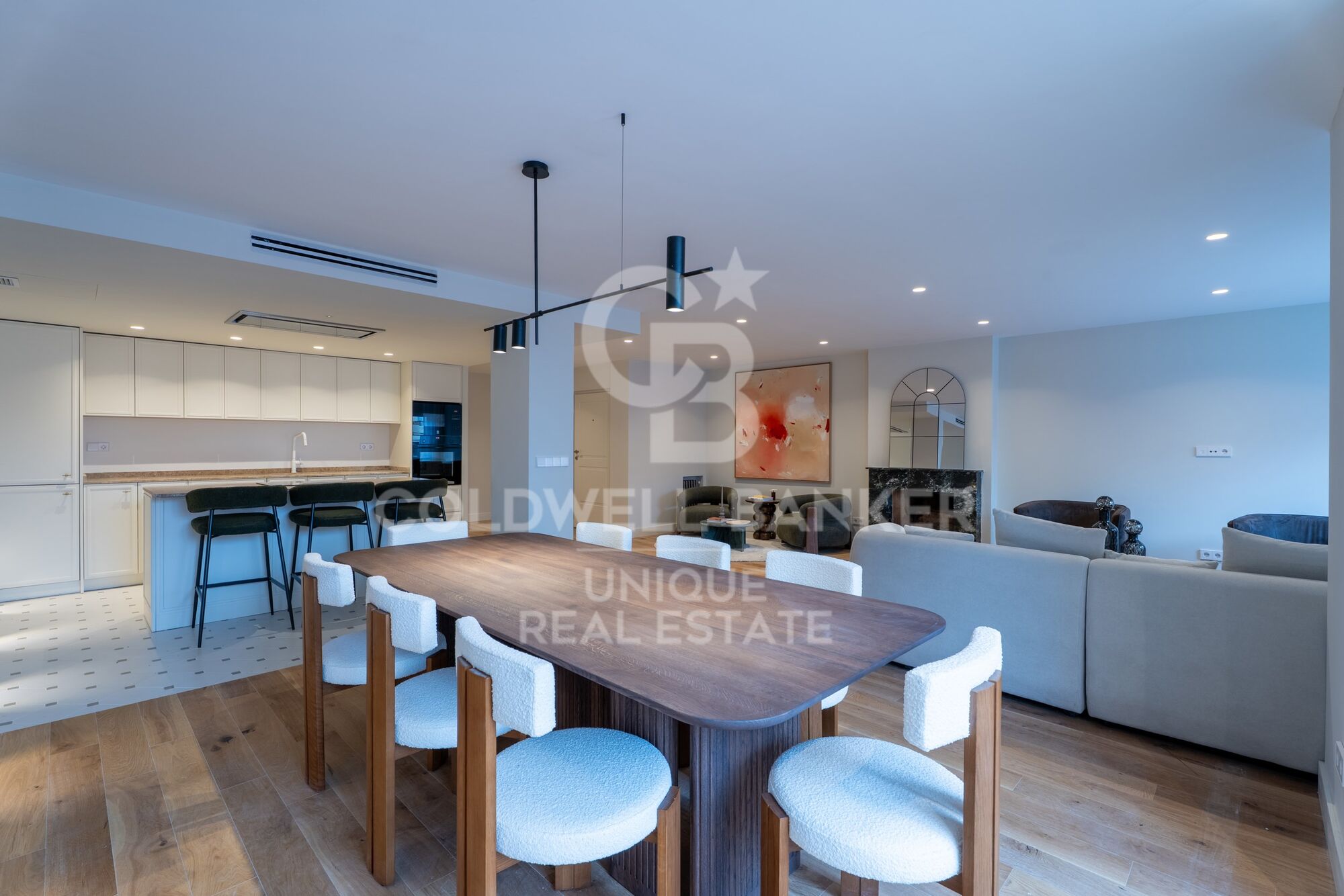 Le salon, aux dimensions généreuses et organisé en différents espaces, crée une atmosphère élégante et chaleureuse, idéale tant pour la vie quotidienne que pour recevoir des invités.