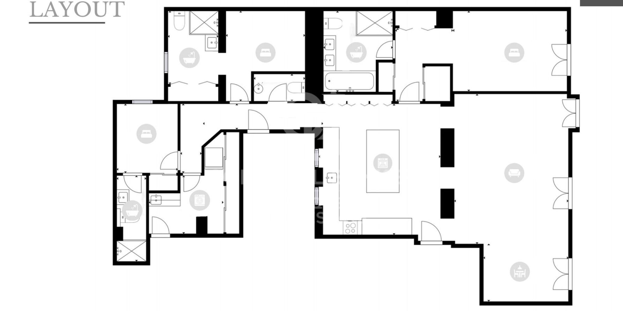 La propriété comprend trois chambres à coucher, chacune décorée dans un style sophistiqué et moderne. Chaque chambre a accès à l'une des trois salles de bains complètes, conçues avec le souci du détail et des finitions de luxe. De plus, il y a des toilettes pour les invités.