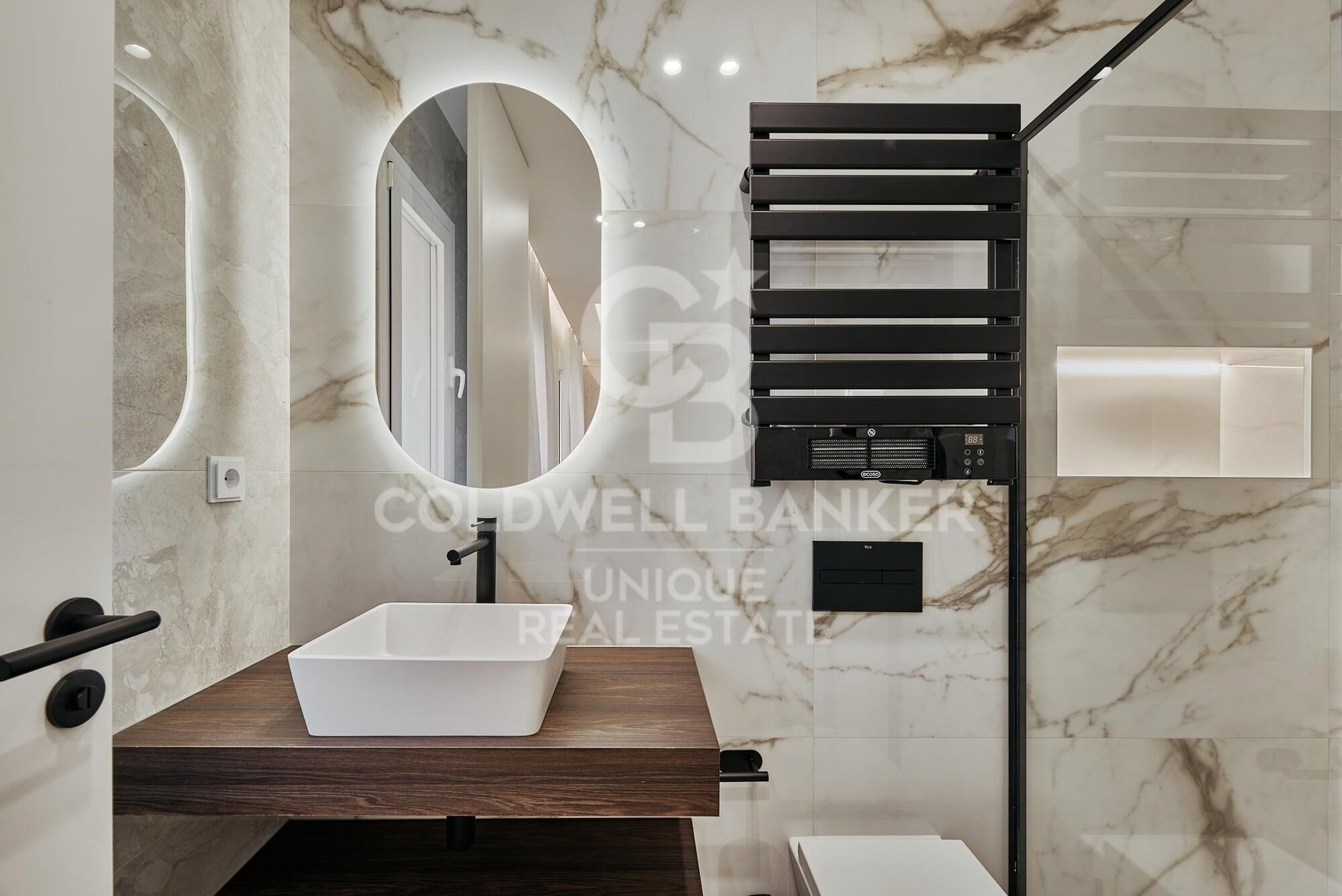 Avec une surface construite de 170 m², le logement se trouve au sixième étage, lumineux, et offre une distribution fonctionnelle comprenant trois grandes chambres, trois salles de bains complètes, des toilettes invités et une buanderie pratique.