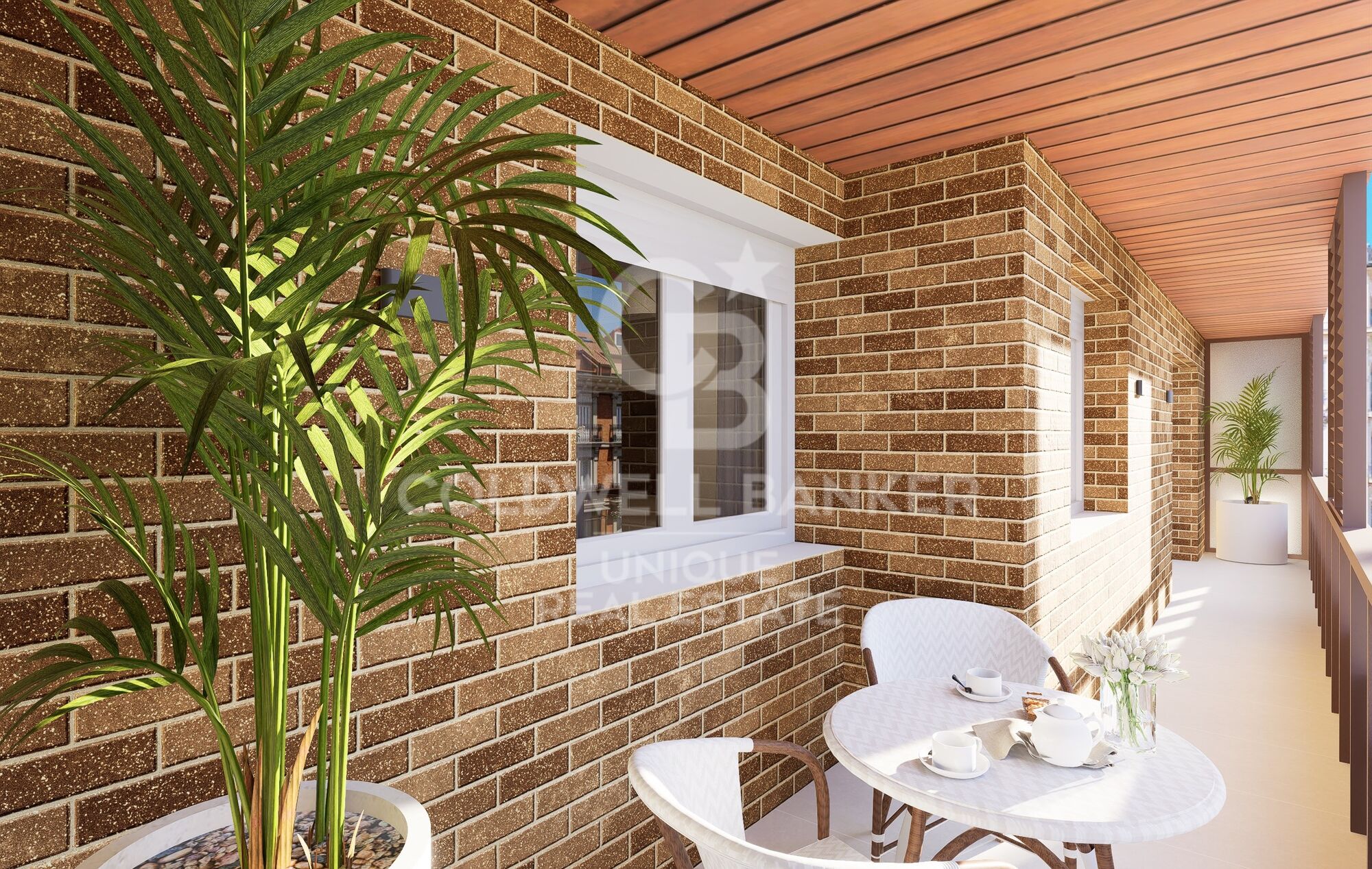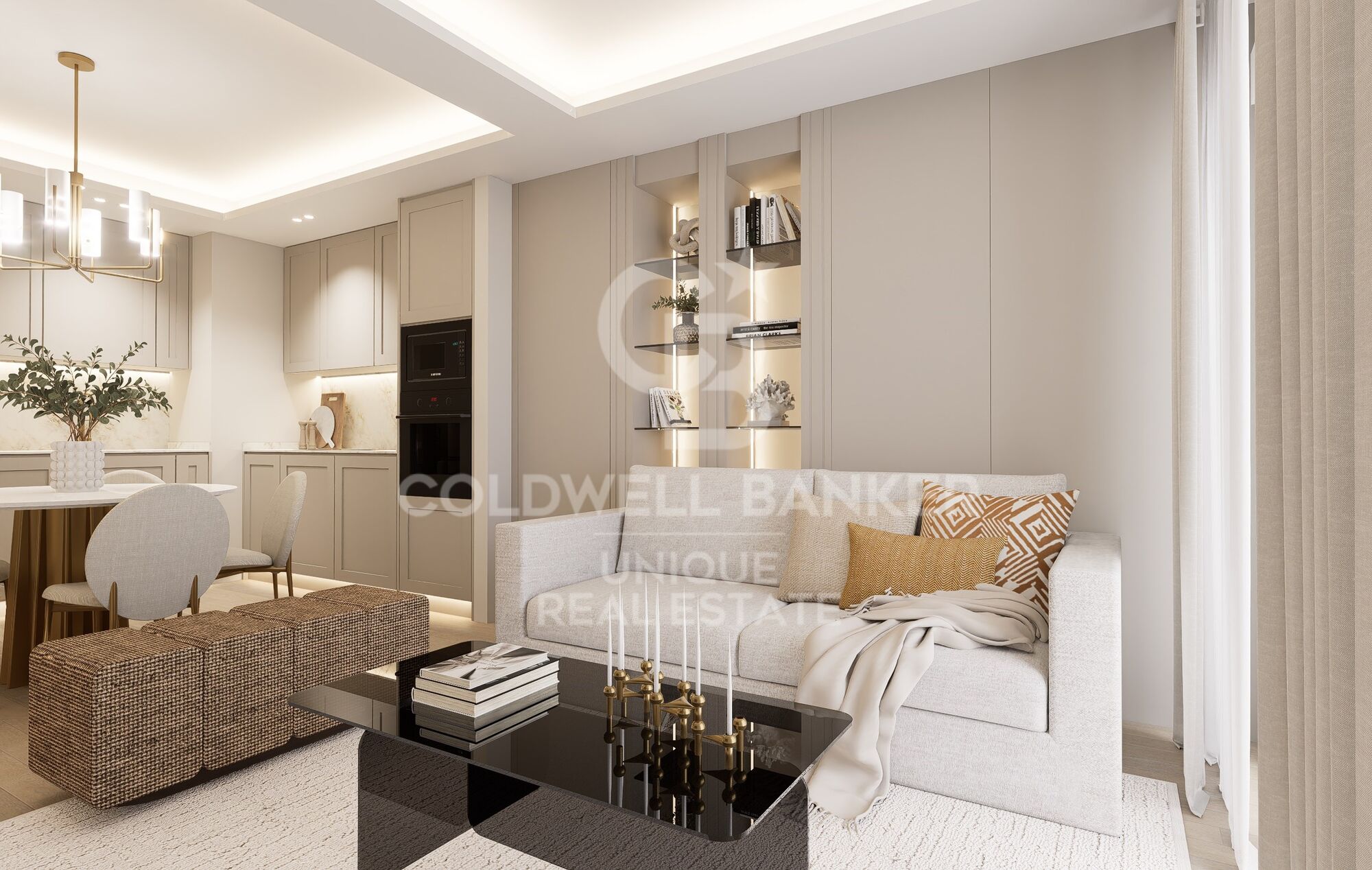 Le logement dispose de deux chambres doubles et de deux salles de bains complètes, offrant intimité et fonctionnalité dans chaque espace. La zone de vie s'organise autour d'un salon extérieur très lumineux, relié de manière fluide à une cuisine ouverte entièrement équipée, créant un espace moderne et chaleureux, idéal aussi bien au quotidien que pour recevoir des invités. Depuis le salon, on accède à une agréable terrasse, parfaite pour profiter de moments en plein air sans quitter l'environnement urbain.