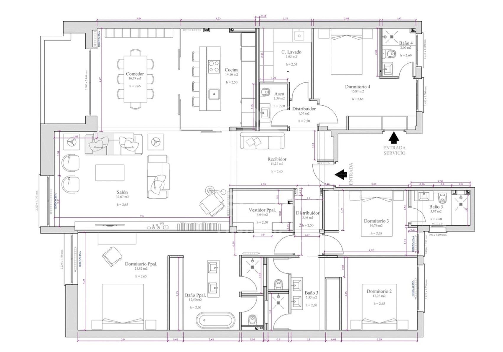 Elle dispose de quatre chambres en suite et d'un WC de courtoisie, la chambre principale bénéficiant d'un grand dressing. L'appartement comprend également une buanderie et un accès depuis le salon à une terrasse qui peut être intégrée, offrant une vue dégagée sur la Calle Ayala, à la hauteur d'un deuxième étage.