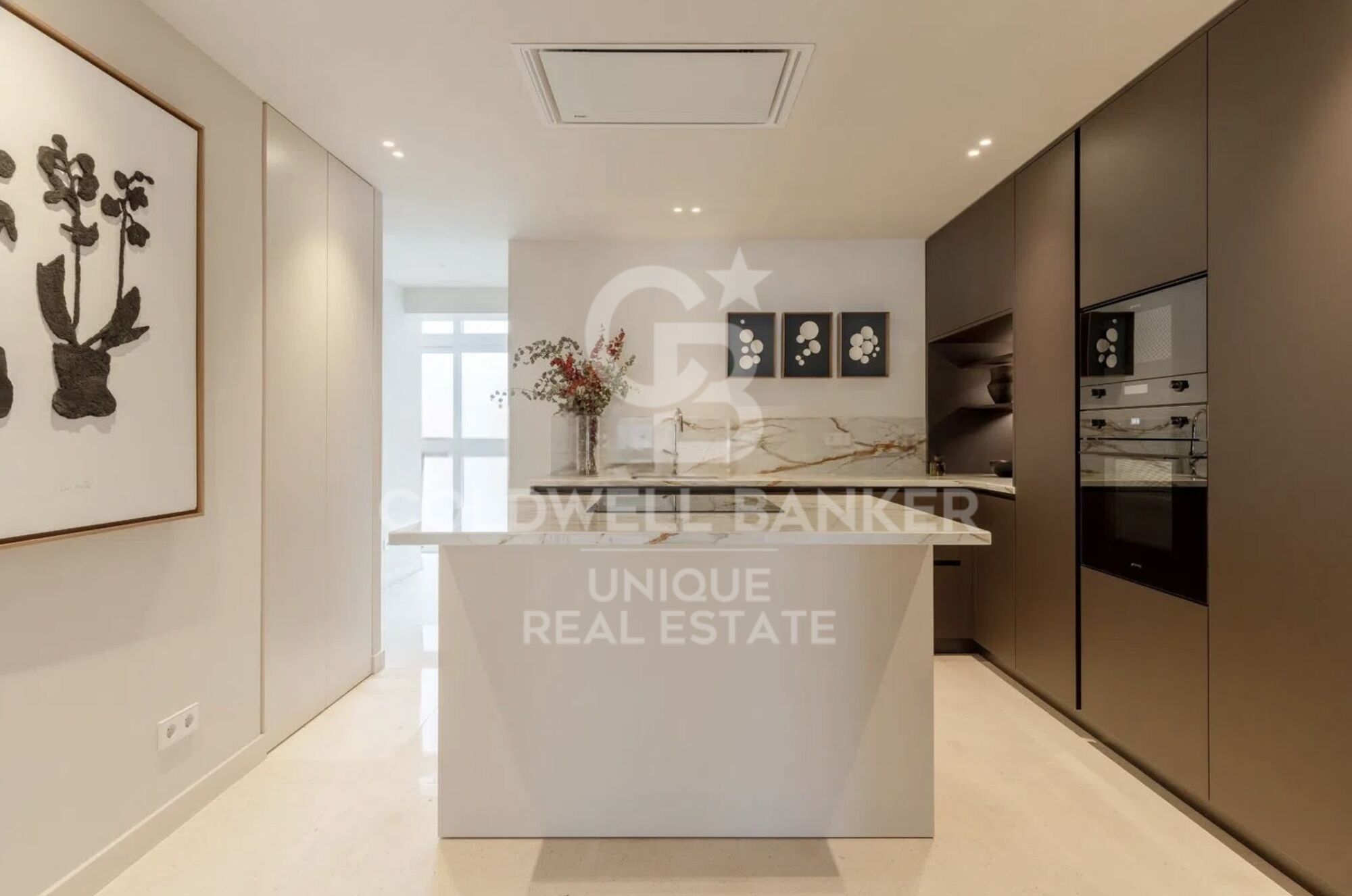 Située au quatrième étage orientée au sud, la propriété bénéficie d'une lumière magnifique toute la journée et d'une vue agréable et dégagée. Avec une surface construite de 239 m², elle offre un aménagement élégant et très fonctionnel, distinguant clairement la zone de jour de l'aire de repos. Le spacieux salon-salle à manger, baigné de lumière naturelle, s'ouvre directement sur une terrasse cosy qui invite à profiter et à se détendre. La cuisine, semi-indépendante et de taille généreuse, est entièrement équipée et comprend un bureau pratique ainsi qu'une buanderie séparée.