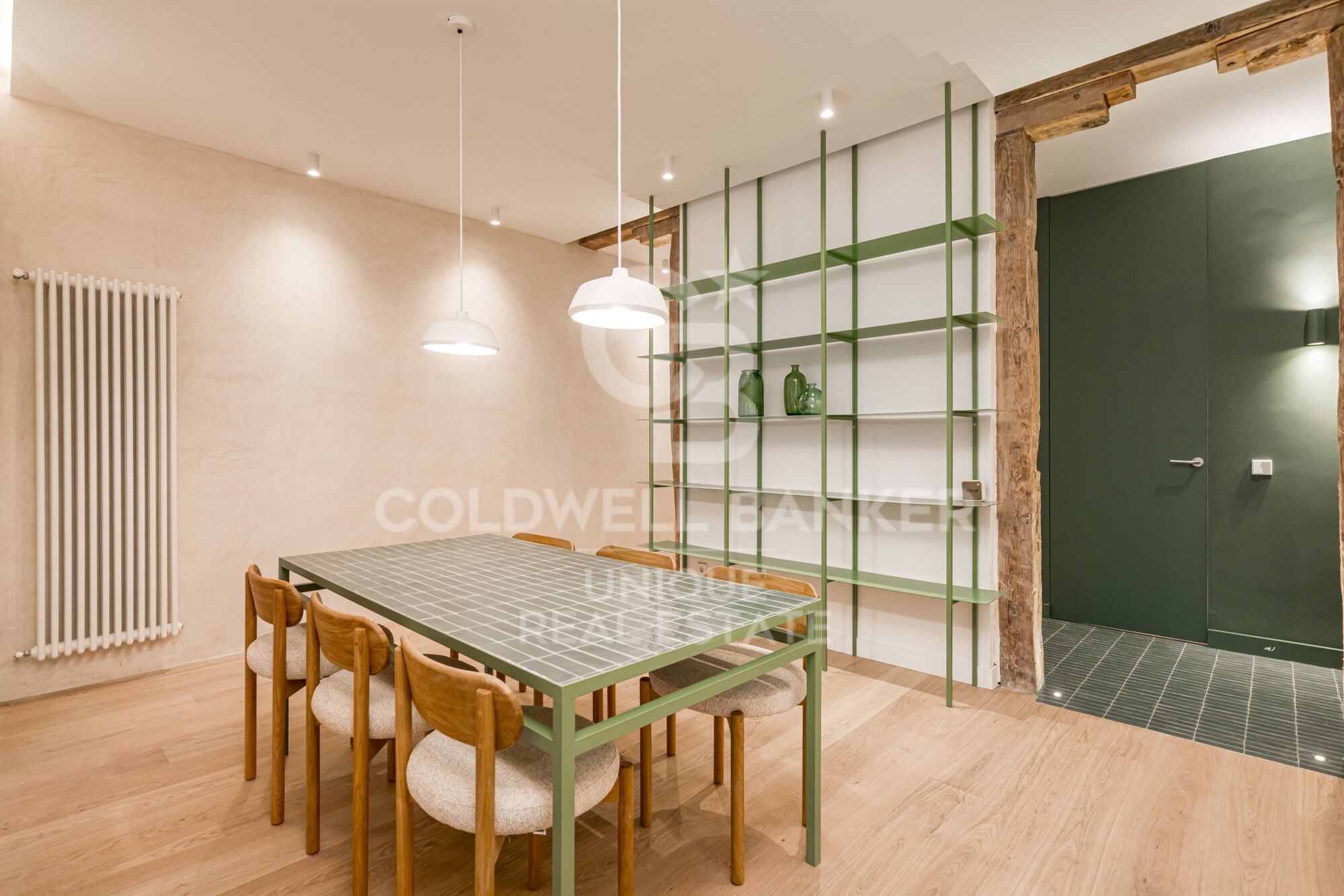 La propriété est le fruit d'un travail artistique soigneux dans lequel des espaces esthétiques, harmonieux et fonctionnels sont intégrés. C'est une maison extérieure très lumineuse, avec trois balcons donnant sur la rue, de hauts plafonds et la structure en bois apparent d'origine du bâtiment, qui apporte personnalité et authenticité à l'ensemble.