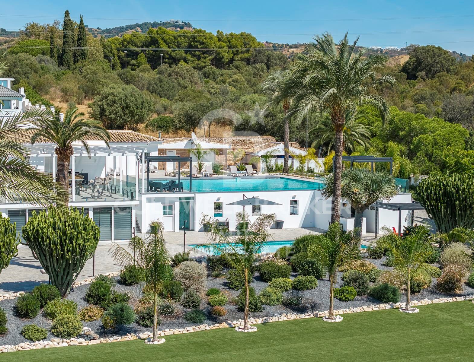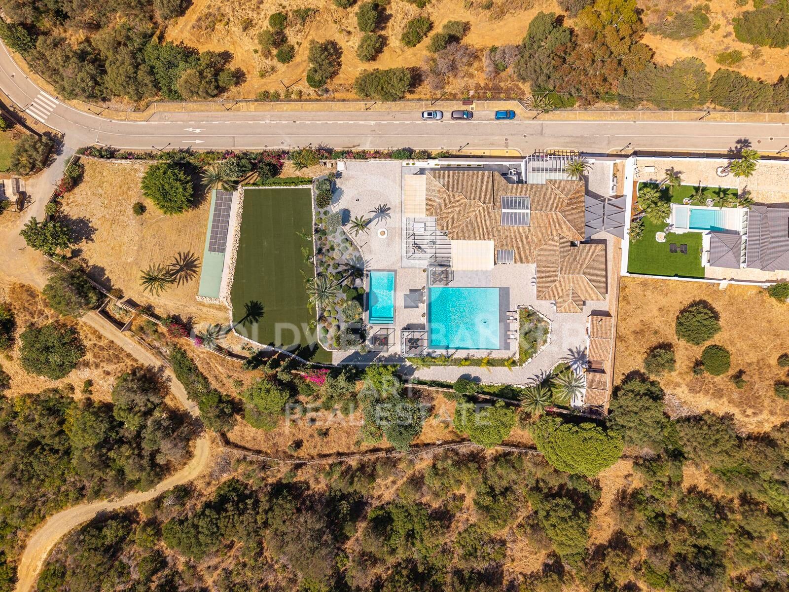 Les espaces extérieurs sont tout simplement remarquables. Un jardin magnifiquement entretenu entoure la villa, avec de charmants coins propices à la détente. De vastes terrasses offrent des vues panoramiques sur les collines et la mer. Deux piscines spectaculaires ajoutent au confort de vie : une au niveau principal pour un accès facile, et une autre sur une terrasse inférieure avec des vues impressionnantes. Des zones détente, un espace barbecue, deux salles à manger extérieures, un bar, et des coins ombragés ou ensoleillés offrent une expérience en plein air incomparable.