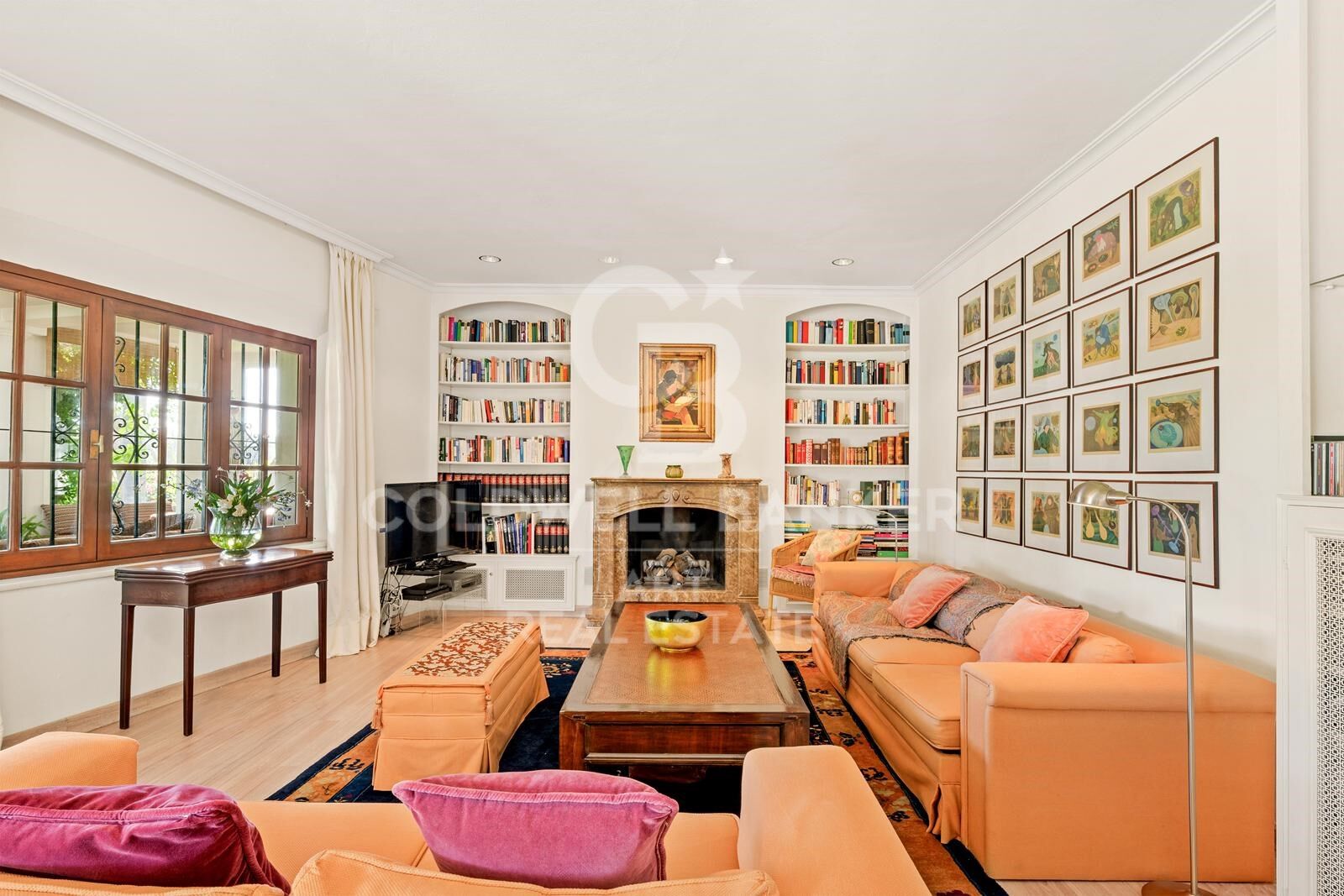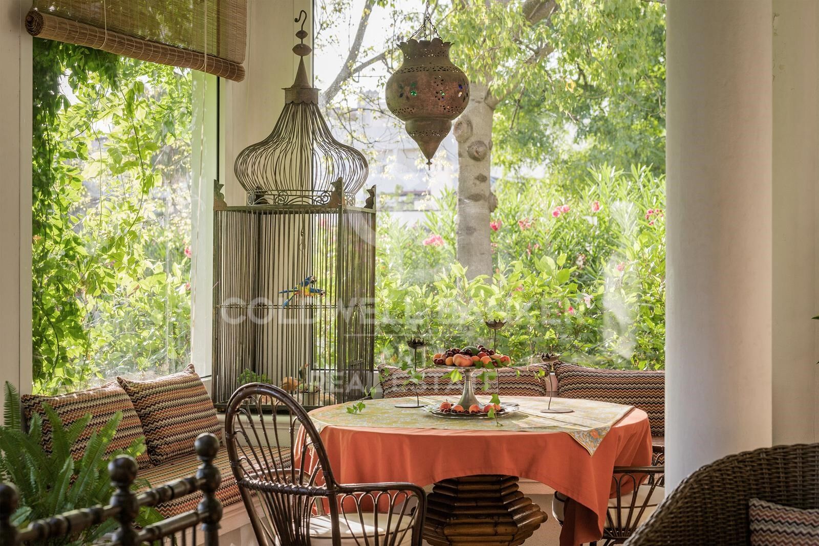 Le salon principal est divisé en deux espaces confortables : l'un avec une cheminée en marbre, l'autre ouvrant sur une large véranda couverte. La terrasse a été conçue pour être appréciée toute l'année, avec un coin repas ombragé et un espace détente orienté vers la mer, parfait pour admirer les couchers de soleil.