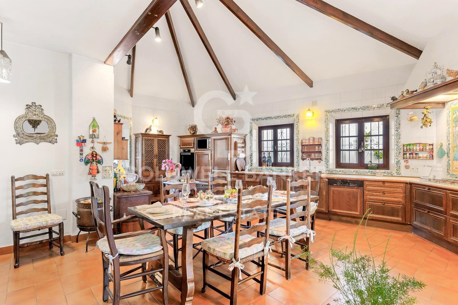 La cuisine de 40m², au cur de la maison, est pleine de charme andalou avec ses carreaux peints à la main, ses poutres en bois apparentes et ses vues spectaculaires sur le jardin et les montagnes. Elle donne directement sur la terrasse et intègre une buanderie, idéale pour la vie de famille ou les réceptions.