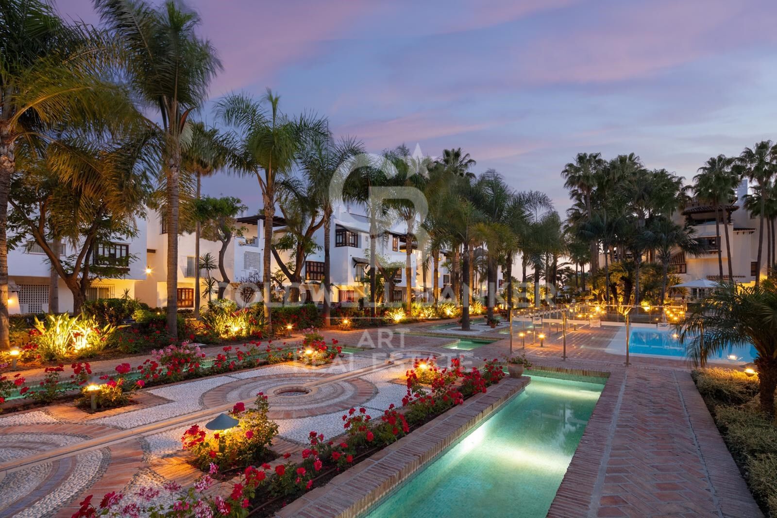Cet appartement exclusif dispose d'un service de sécurité et de conciergerie 24h/24. Entourée de luxuriants jardins tropicaux, cette propriété en bord de mer est un véritable havre de paix avec une âme andalouse.