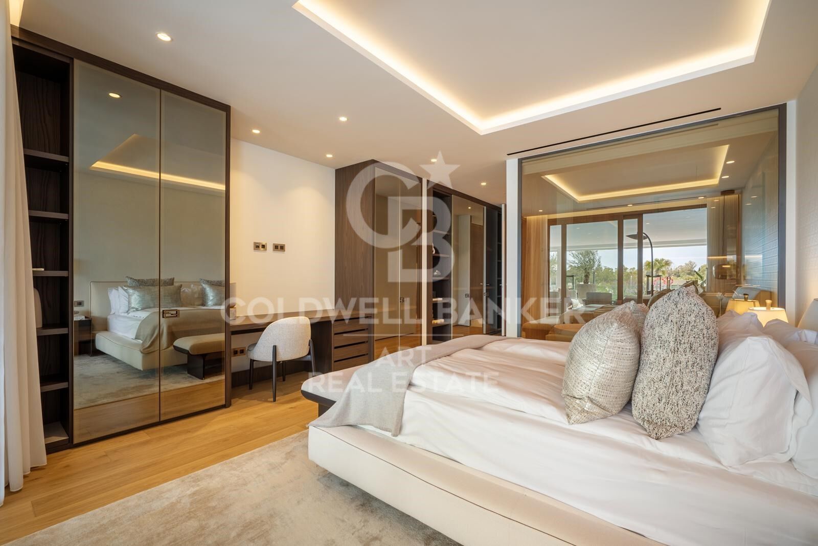 Cet appartement duplex exceptionnel au rez-de-chaussée offre un mélange harmonieux de luxe moderne et de charme méditerranéen, soigneusement conçu sur deux vastes niveaux. Doté de cinq chambres spacieuses avec salle de bains privative, l'aménagement assure à la fois l'intimité et la fluidité de l'espace. Trois chambres sont situées au rez-de-chaussée, tandis que deux se trouvent au niveau inférieur, accessibles par une entrée privée depuis le garage, idéales pour les invités ou le personnel.