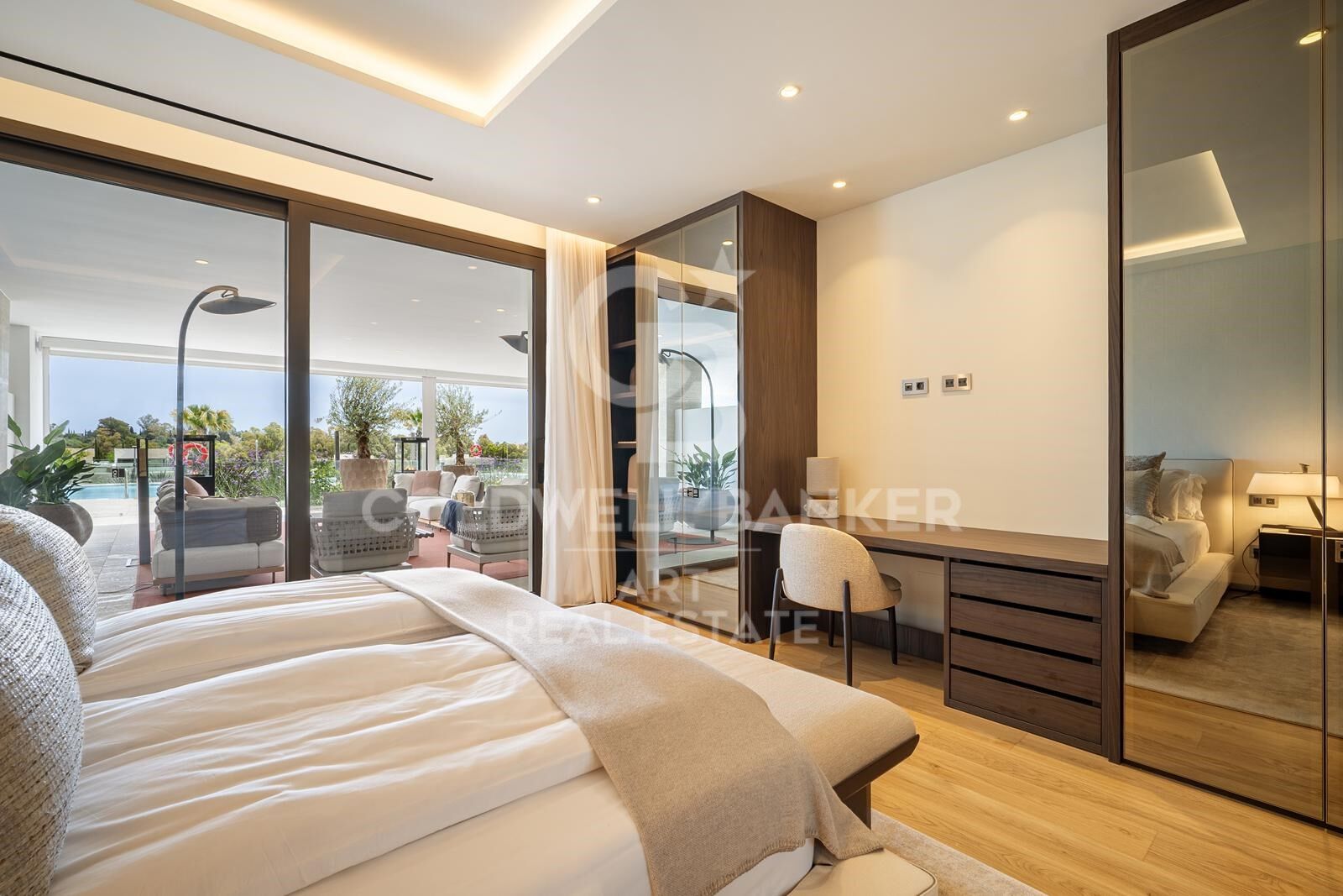 Cet appartement duplex exceptionnel au rez-de-chaussée offre un mélange harmonieux de luxe moderne et de charme méditerranéen, soigneusement conçu sur deux vastes niveaux. Doté de cinq chambres spacieuses avec salle de bains privative, l'aménagement assure à la fois l'intimité et la fluidité de l'espace. Trois chambres sont situées au rez-de-chaussée, tandis que deux se trouvent au niveau inférieur, accessibles par une entrée privée depuis le garage, idéales pour les invités ou le personnel.