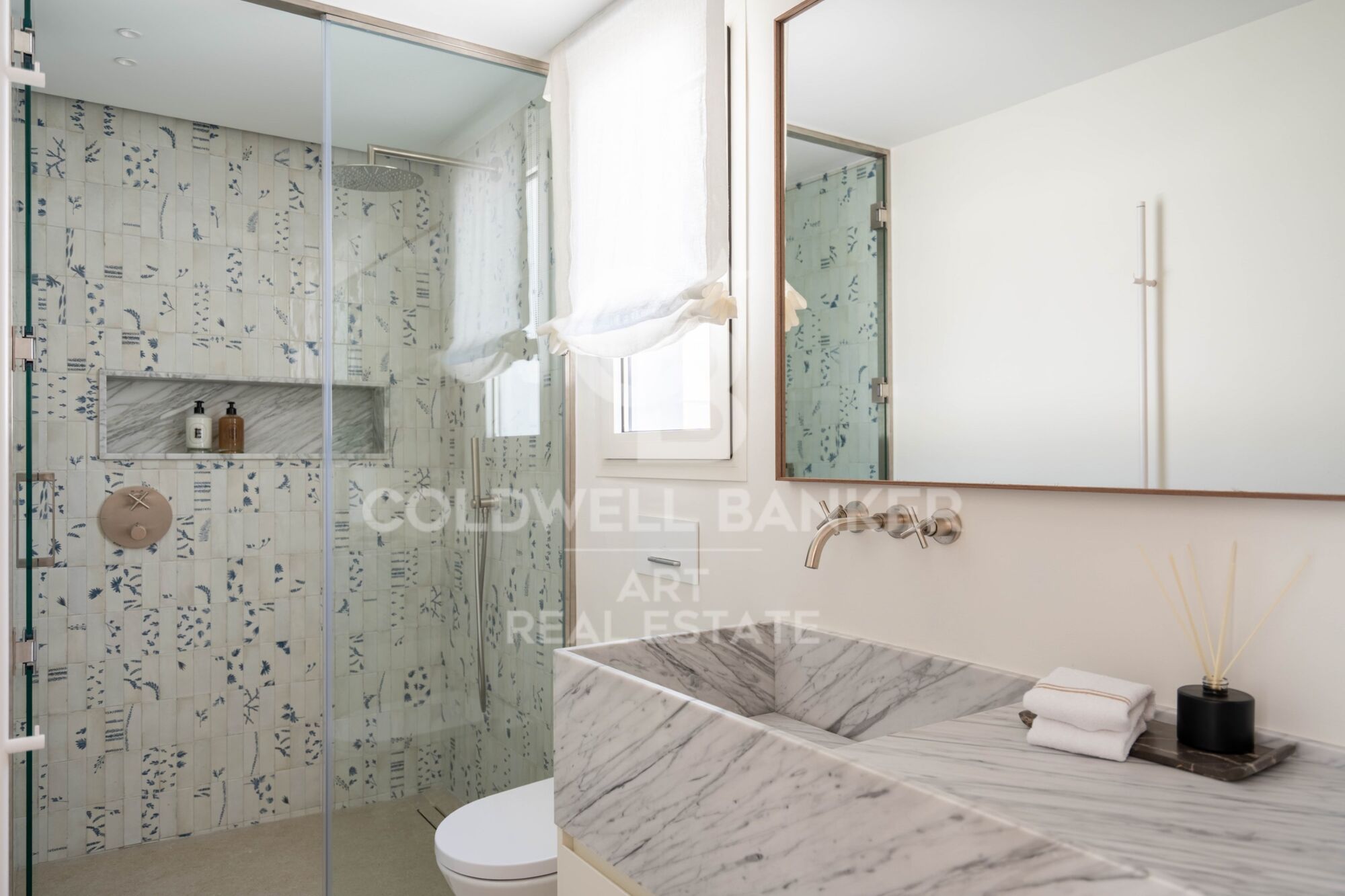 Le rez-de-chaussée vous accueille avec une luminosité naturelle et un plan ouvert reliant le salon, la salle à manger et la cuisine. De grandes portes coulissantes donnent sur un jardin privé conçu pour profiter de l'extérieur, avec piscine chauffée, cuisine d'été et élégantes zones de séjour et de repasvotre propre refuge en bord de mer. Une suite invités avec salle de bain privative et un WC complètent ce niveau.