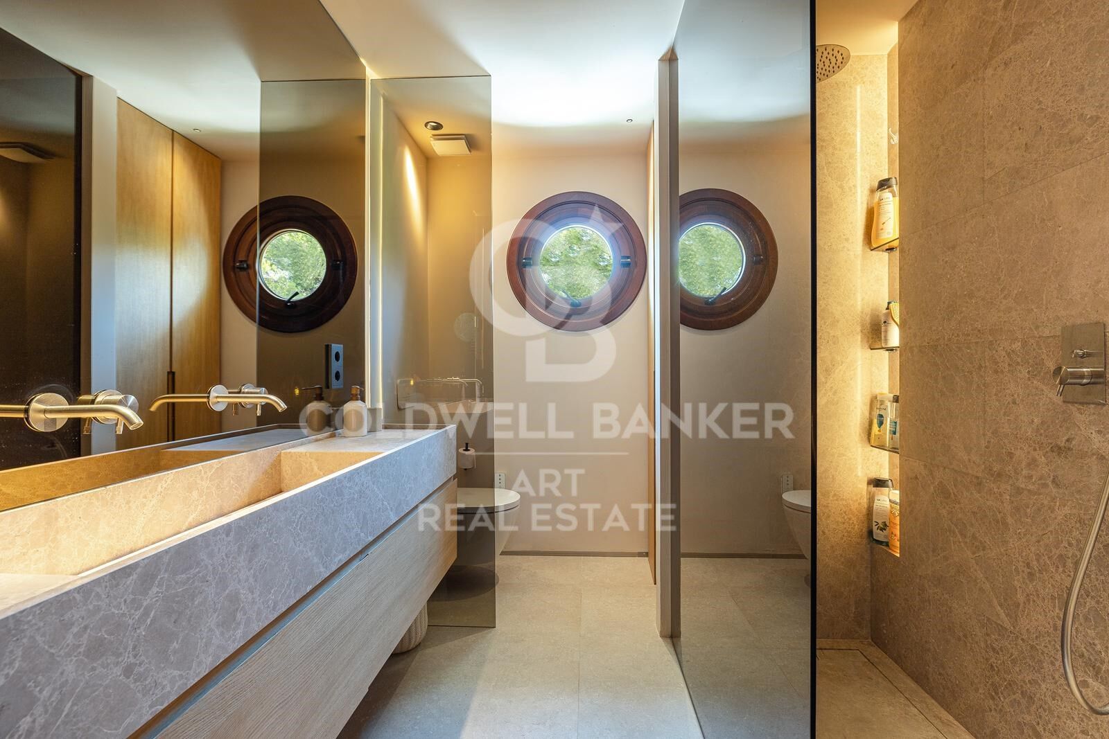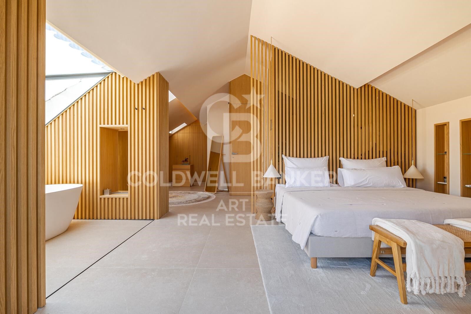 Le niveau principal comprend deux chambres avec salle de bains privative, décorées dans un style raffiné et confortable. À l'étage supérieur, la suite parentale propose de hauts plafonds, un dressing, une salle de bains paisible avec baignoire, et une atmosphère intimiste et sereine.