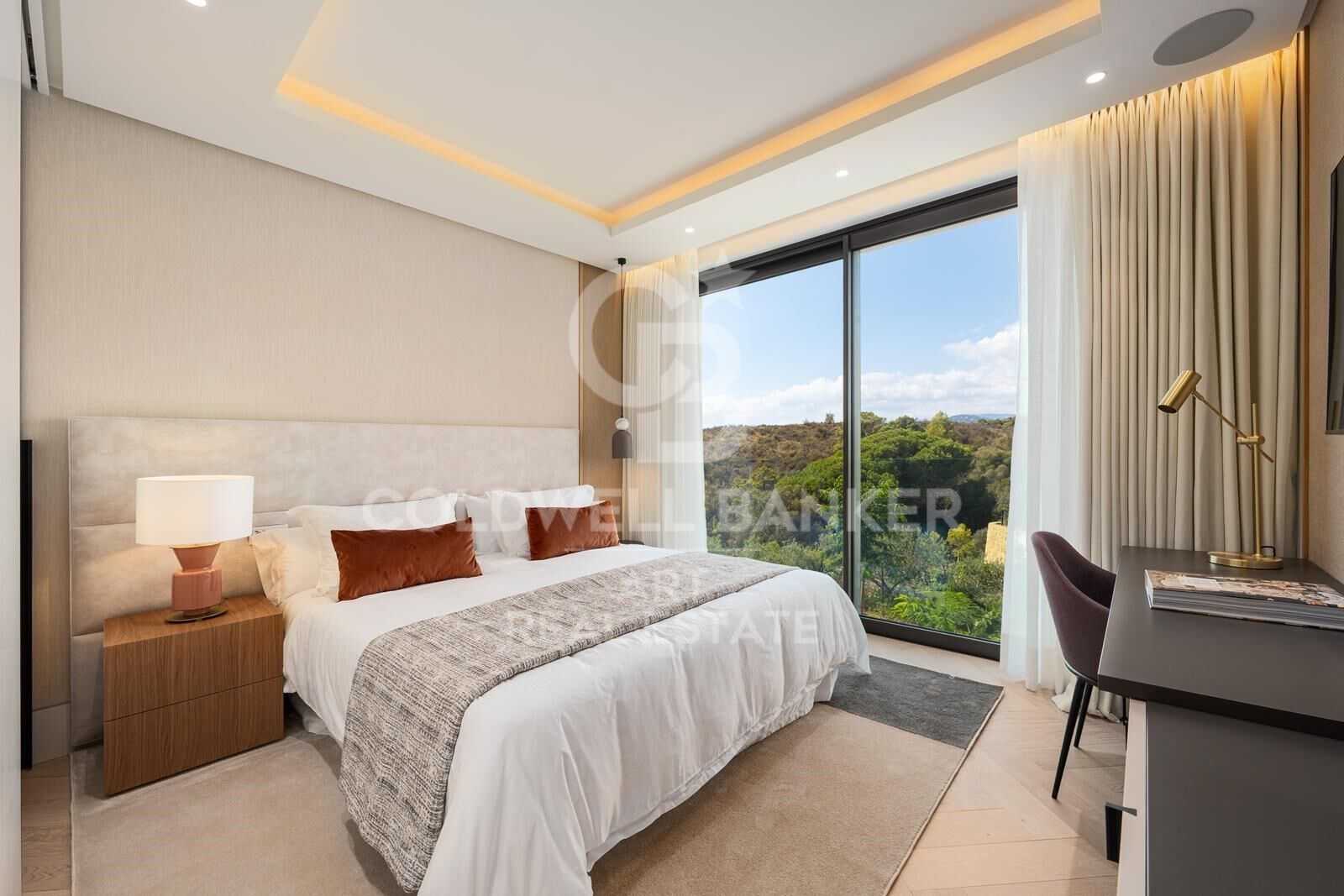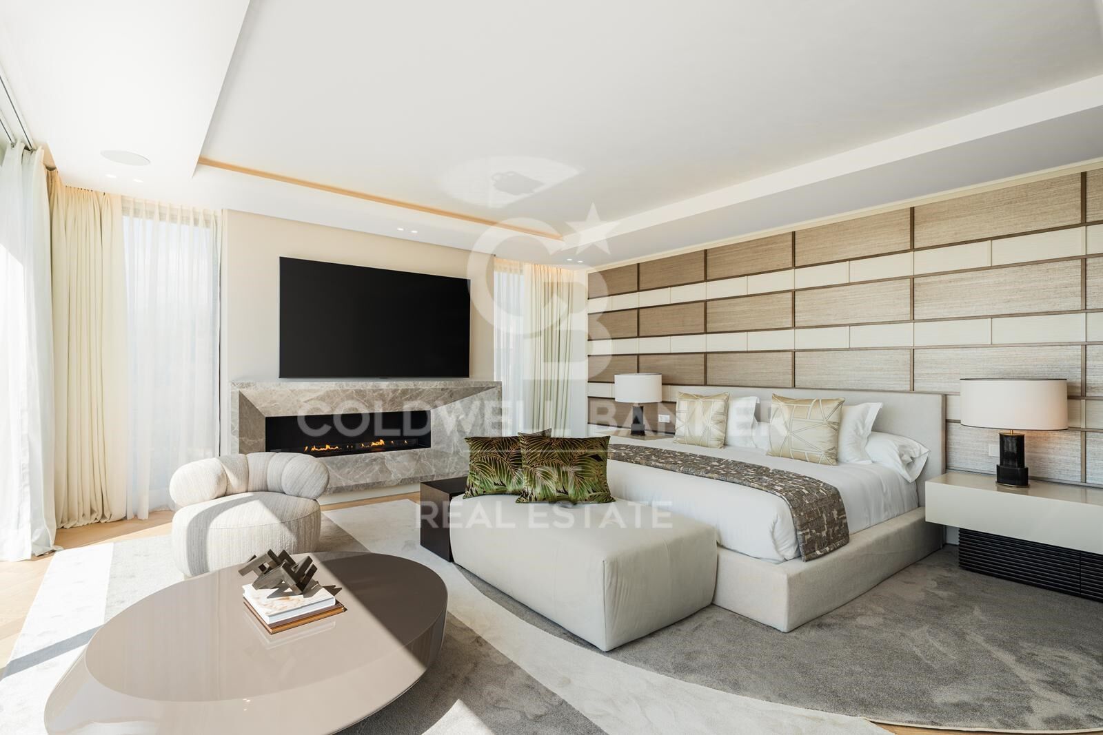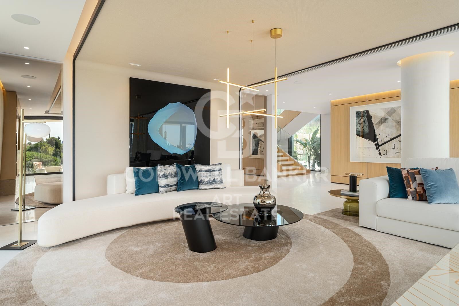 Au rez-de-chaussée, le plan ouvert relie de manière fluide les espaces salon, salle à manger et cuisine. De grandes baies vitrées s'ouvrent sur une vaste terrasse donnant sur les jardins et la piscine, idéale pour les repas en plein air et la détente. Une cuisine secondaire entièrement équipée complète la cuisine principale, tandis que deux chambres d'amis avec salles de bains privatives offrent confort et intimité. Chaque détail reflète le concept d'aménagement intérieur raffiné de Pedro Peña, avec un mobilier, des matériaux et des textures soigneusement sélectionnés, rehaussés d'uvres d'art exclusives.