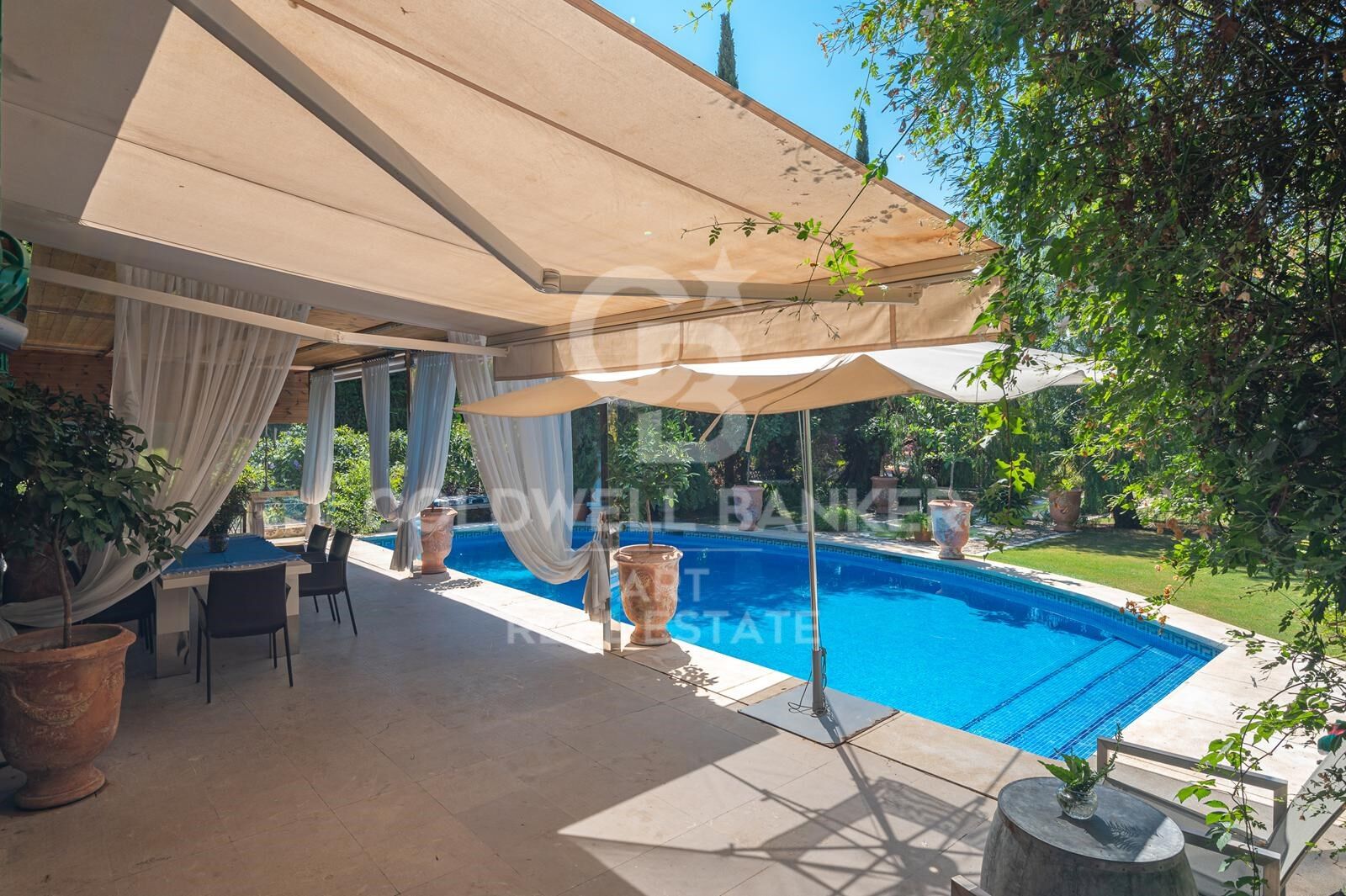 Répartie sur deux niveaux et un demi-sous-sol, la villa offre des vues dégagées sur la verdure environnante. Son emplacement surélevé au sommet d'une colline garantit intimité, lumière naturelle abondante et superbes panoramas. À l'entrée, une fontaine andalouse ornementale accueille les visiteurs dans un jardin privé, empreint de sérénité.