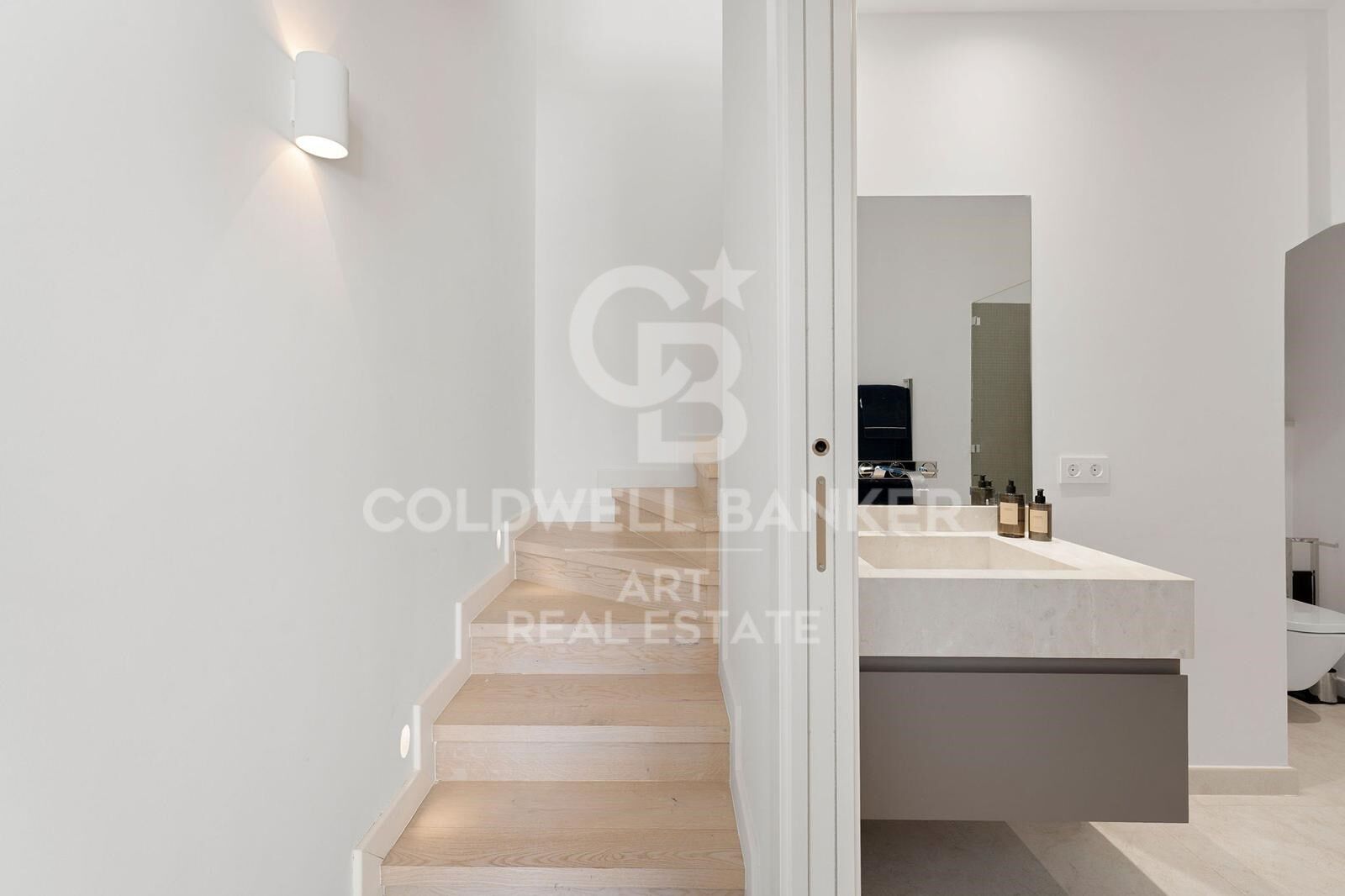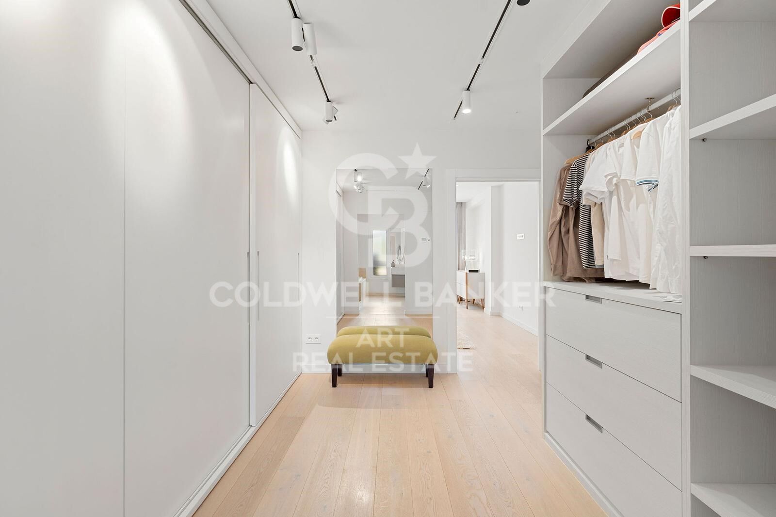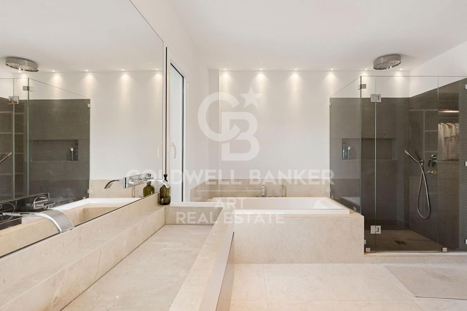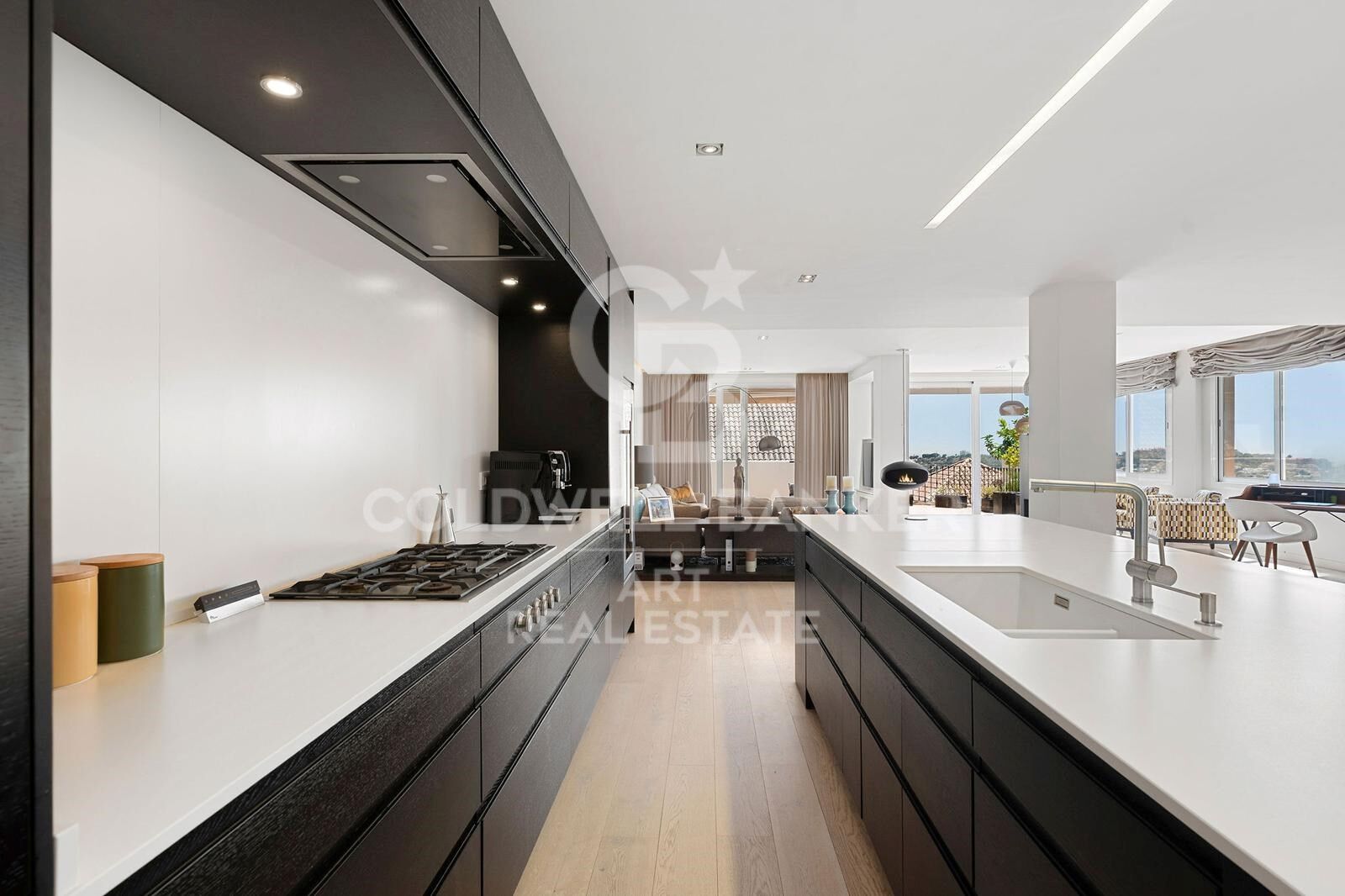Réparti sur deux niveaux, l'appartement comprend quatre chambres et quatre salles de bains et demie. À l'étage inférieur, une chambre en suite avec balcon français donne sur la piscine, parfaite pour les invités. L'étage principal dispose d'un grand espace de vie ouvert avec cuisine Gaggenau, salon, salle à manger et accès à une grande terrasse avec vue imprenable sur la mer et les montagnes.