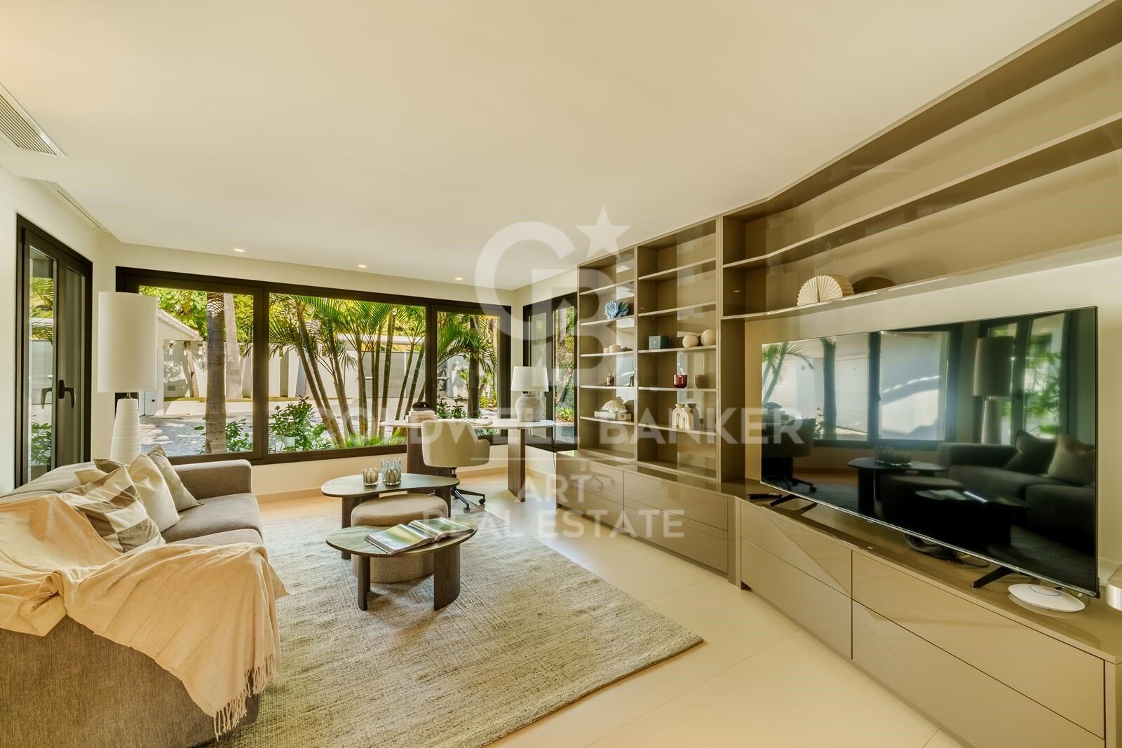 Une terrasse couverte entourant la villa offre un cadre idéal pour vivre en extérieur, parfait pour profiter du climat agréable de Marbella toute l'année. À l'intérieur, la villa dispose d'un hall d'entrée avec vue sur le jardin, un salon spacieux ouvrant sur la terrasse et le jardin, ainsi qu'une cuisine ouverte professionnelle Danespan, avec un grand îlot central et deux espaces de repas.