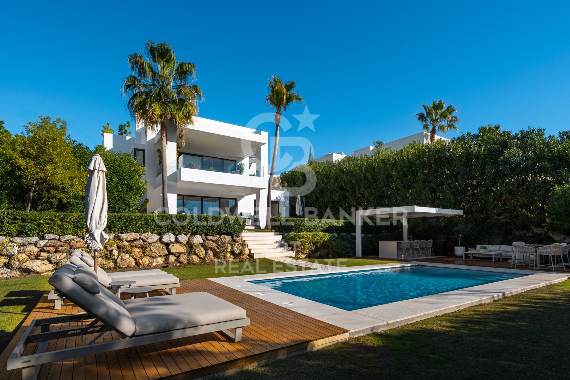 La villa bénéficie d'un magnifique jardin paysager privé, d'une piscine, de plusieurs terrasses et d'un solarium panoramique sur le toit, créant un mode de vie intérieur-extérieur fluide avec soleil toute la journée et vues spectaculaires au coucher du soleil. Une élégante pergola bioclimatique avec une cuisine extérieure entièrement équipée dans le jardin facilite les repas en plein air et les moments de détente.