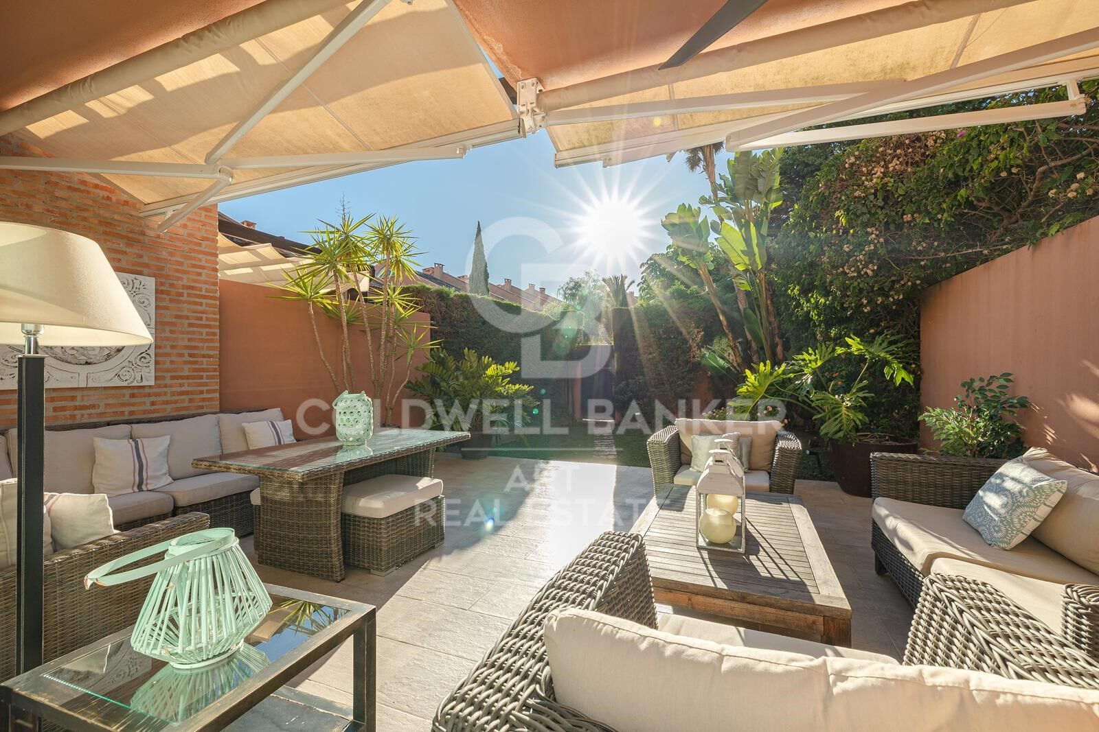 L'entrée donne sur un agréable porche couvert avec vue sur un jardin privé et arboré, idéal pour les repas en plein air ou pour se détendre. Ce jardin paisible a un accès direct aux espaces communs comprenant une grande piscine, une piscine pour enfants et un court de padel, alliant vie privée et vie communautaire.