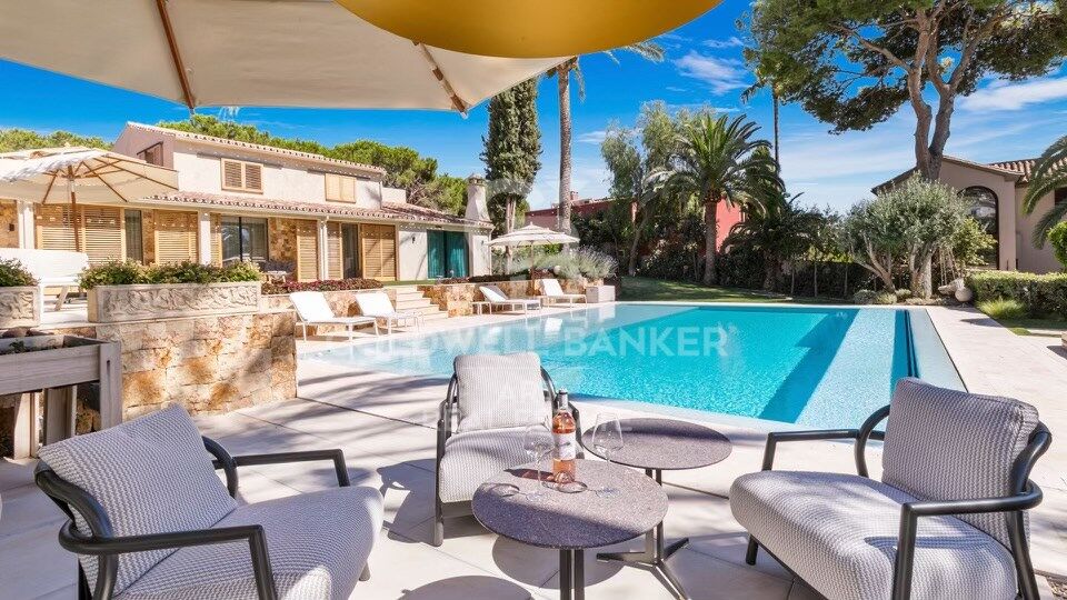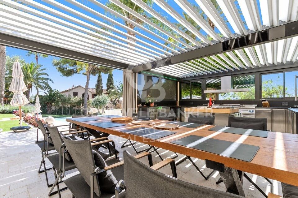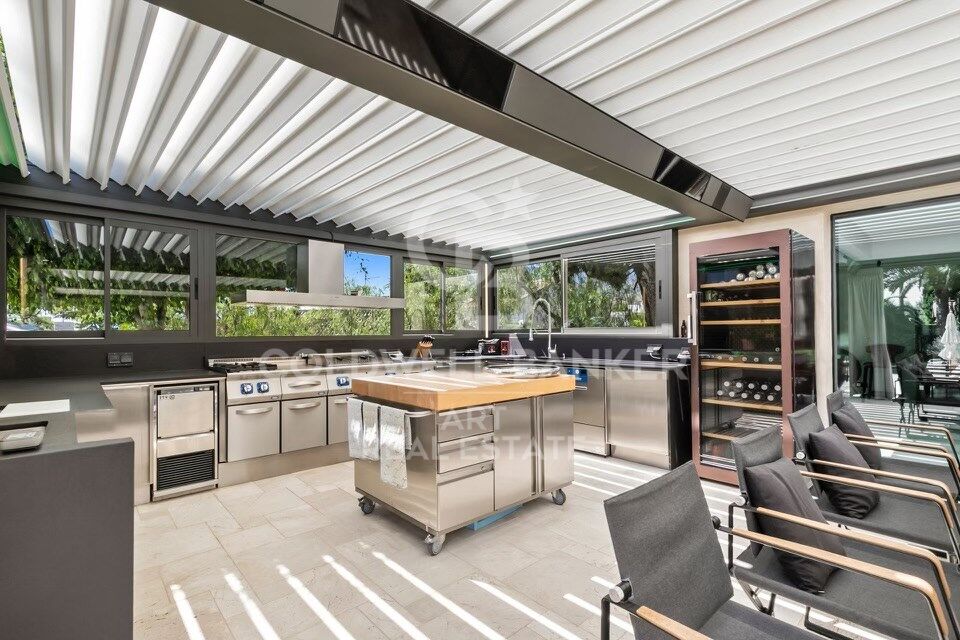 Pensée pour le confort au quotidien, la villa propose également une salle de jeux pour enfants, un bureau, et une salle de sport entièrement équipée. À l'extérieur, une spectaculaire cuisine professionnelle de style restaurant côtoie la piscine chauffée et le jacuzzi, entourés de coins détente chaleureux et élégants.